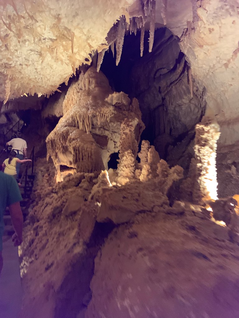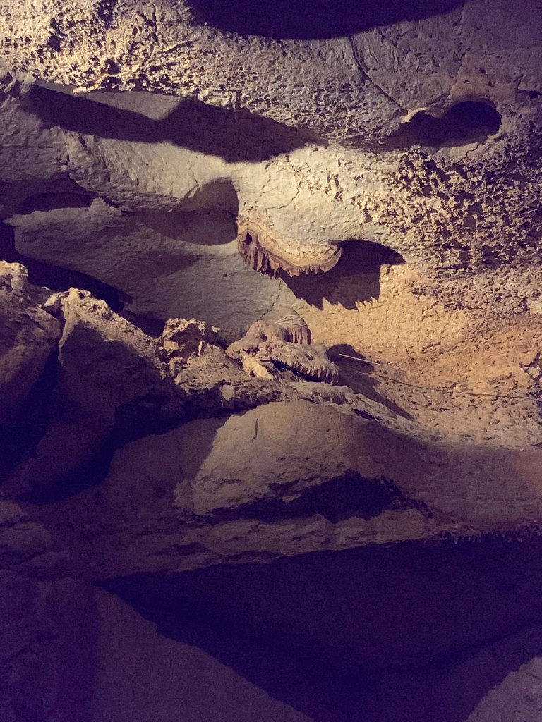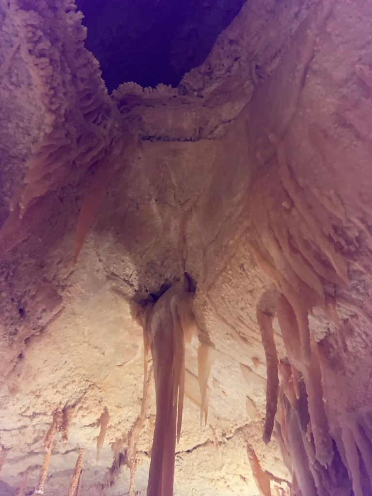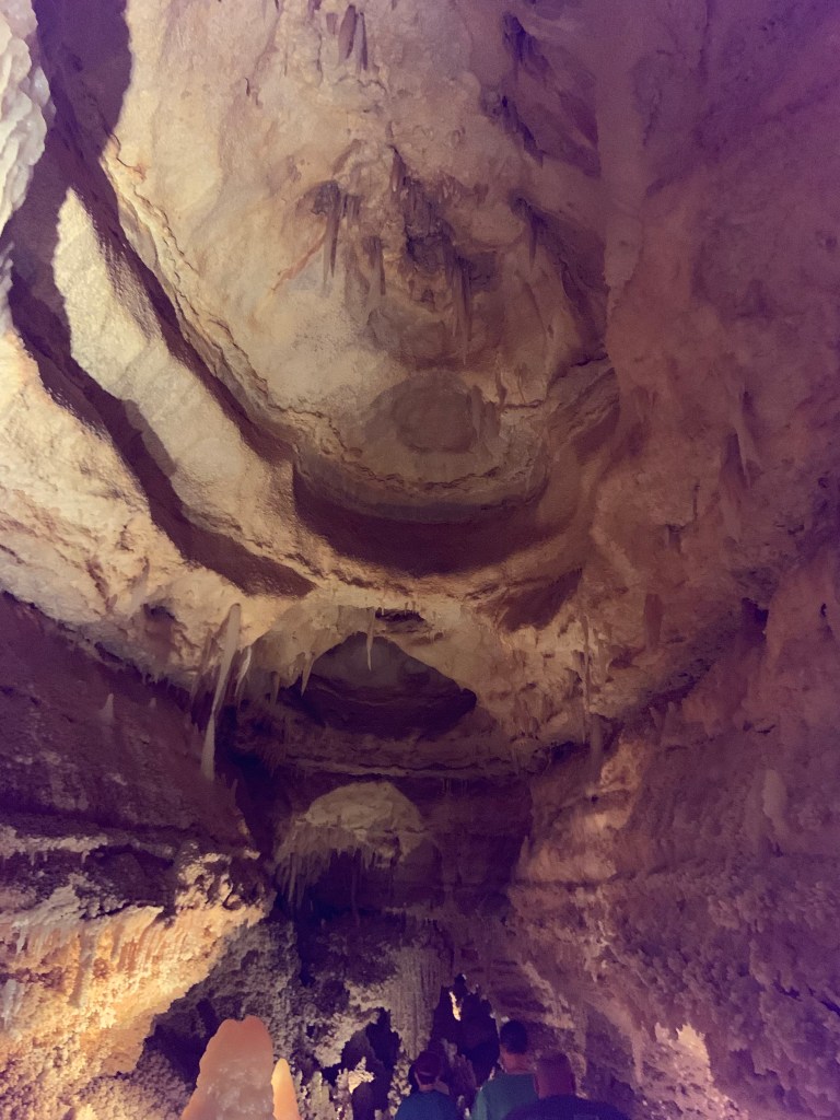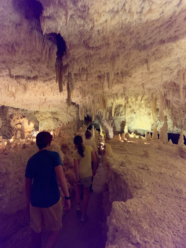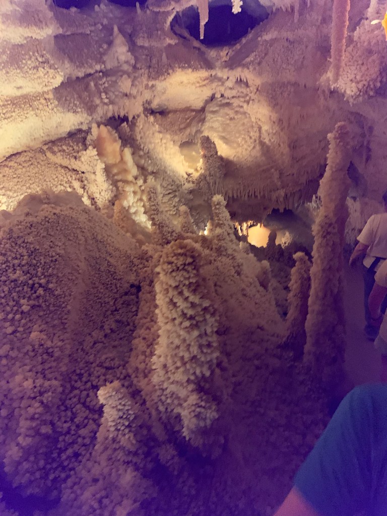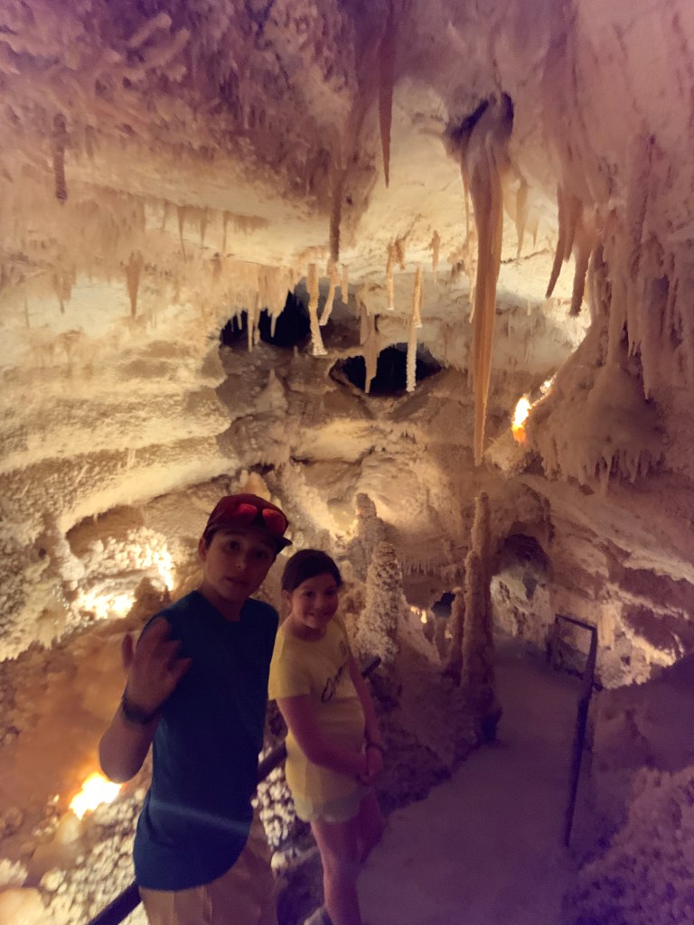 On this tour, the kiddos saw totally different formations than the other two caves and frankly, in a much more personal and intimate setting. Our guide knew her geology; the calcite triangles that seemed to defy gravity growing every which way, the butterfly, soda straws, applesauce, shell impressions, and a whole room full of formations that grew under the water with the water line to prove it. The entire cave was a sea bed at one time. We descended about 150 feet and then climbed back up again. Enjoy the pictures- it took millions of years for these formations to be created.