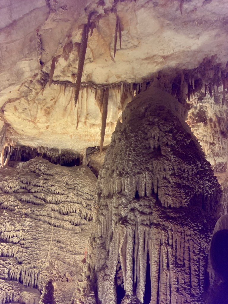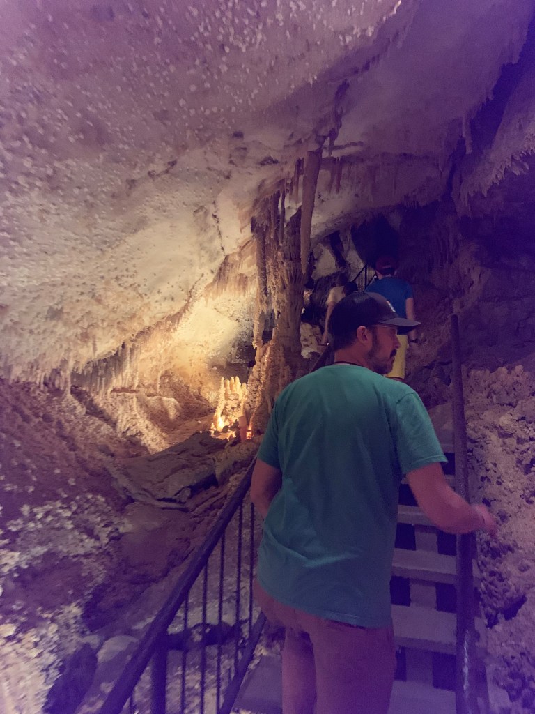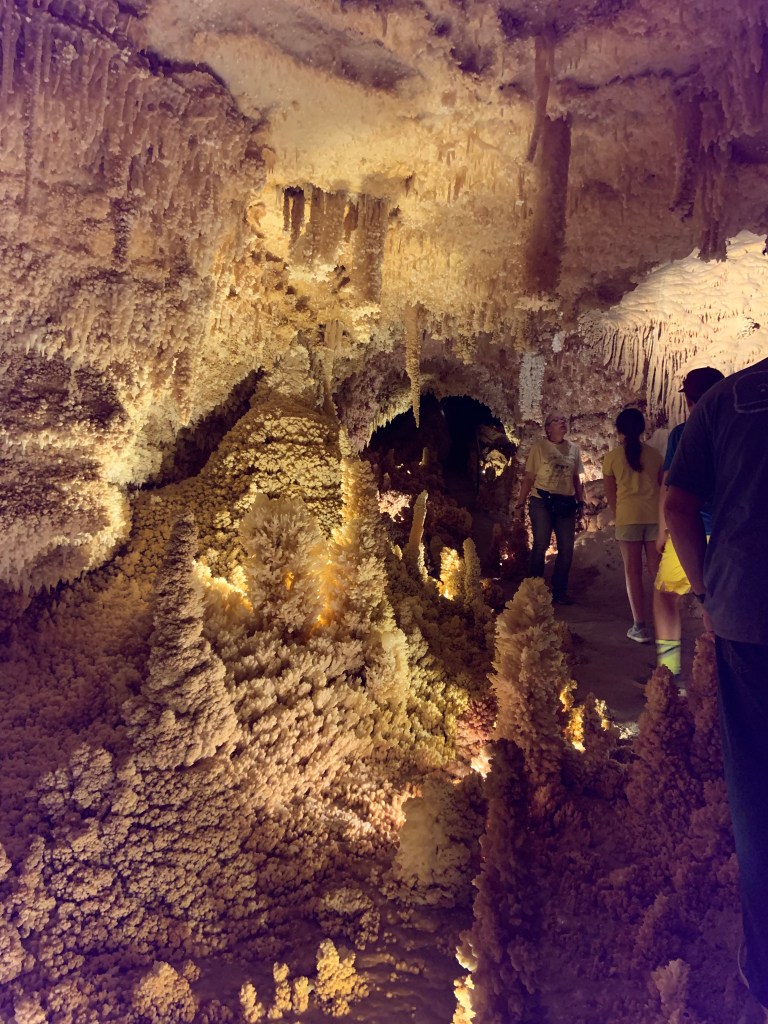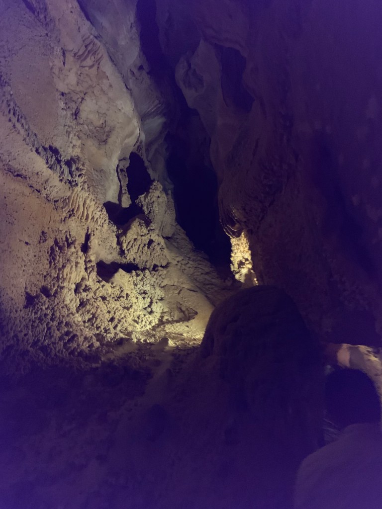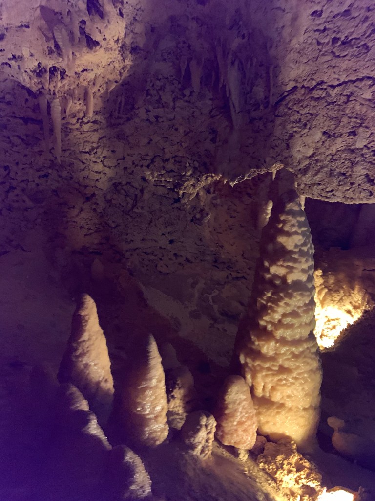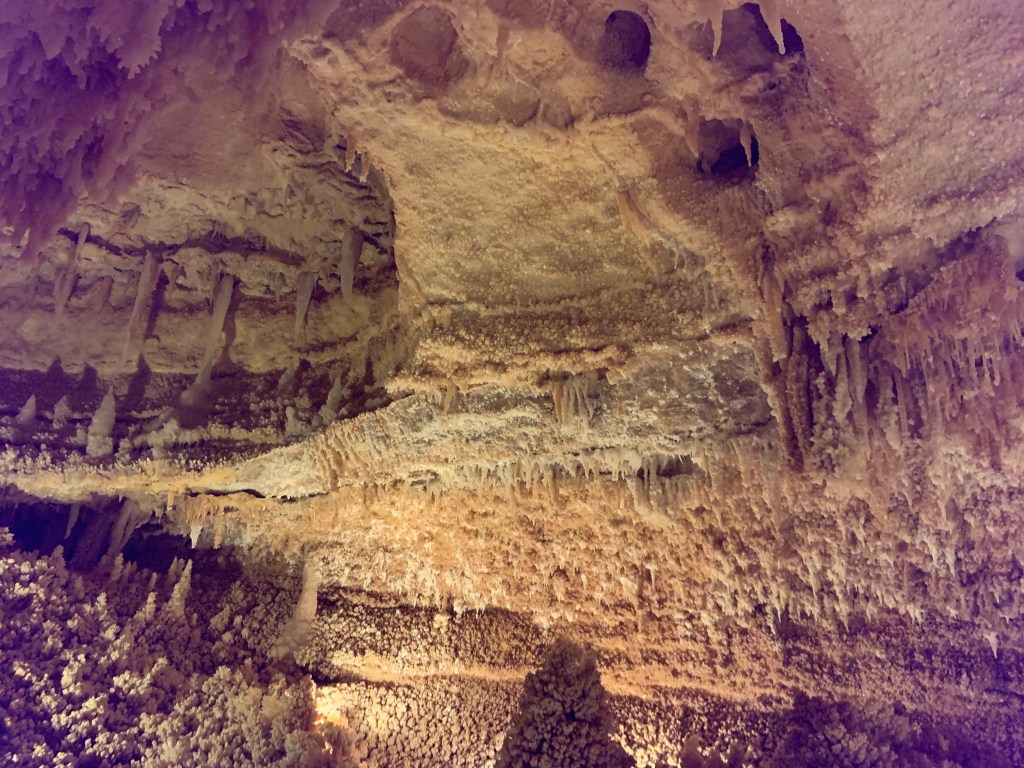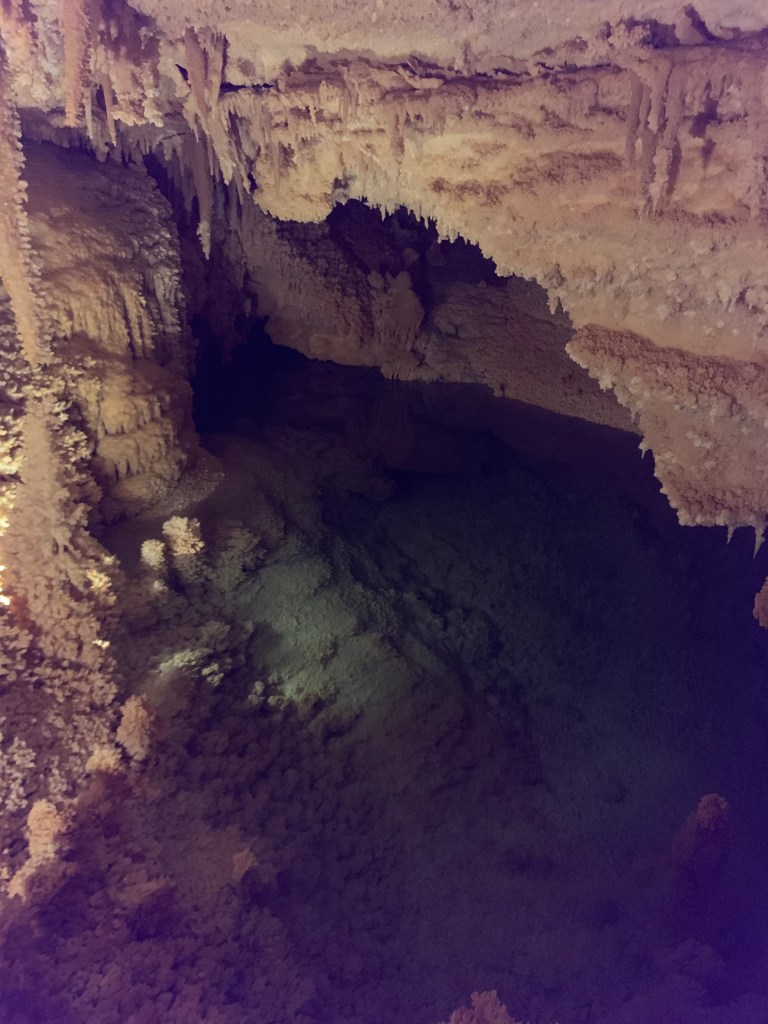 On this tour, the kiddos saw totally different formations than the other two caves and frankly, in a much more personal and intimate setting. Our guide knew her geology; the calcite triangles that seemed to defy gravity growing every which way, the butterfly, soda straws, applesauce, shell impressions, and a whole room full of formations that grew under the water with the water line to prove it. The entire cave was a sea bed at one time. We descended about 150 feet and then climbed back up again. Enjoy the pictures- it took millions of years for these formations to be created.