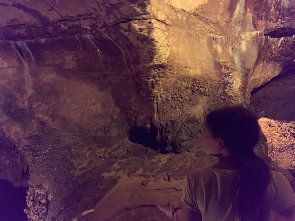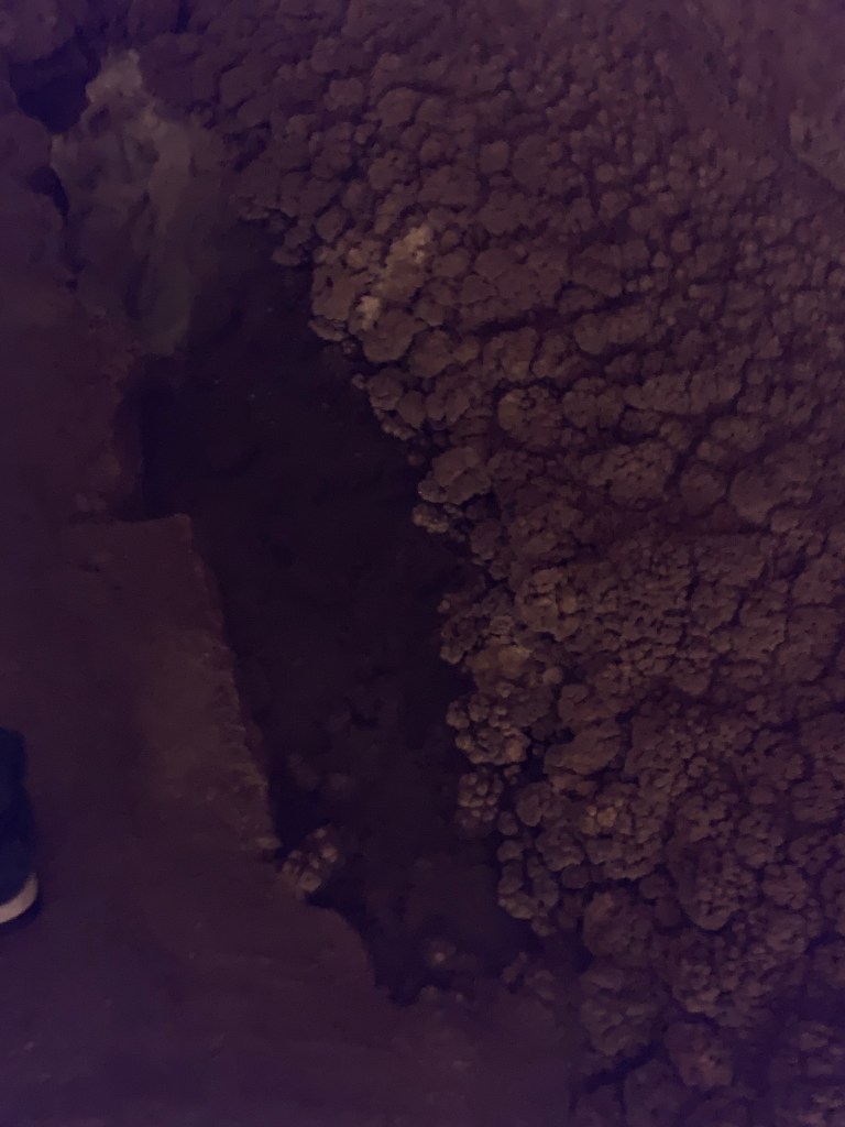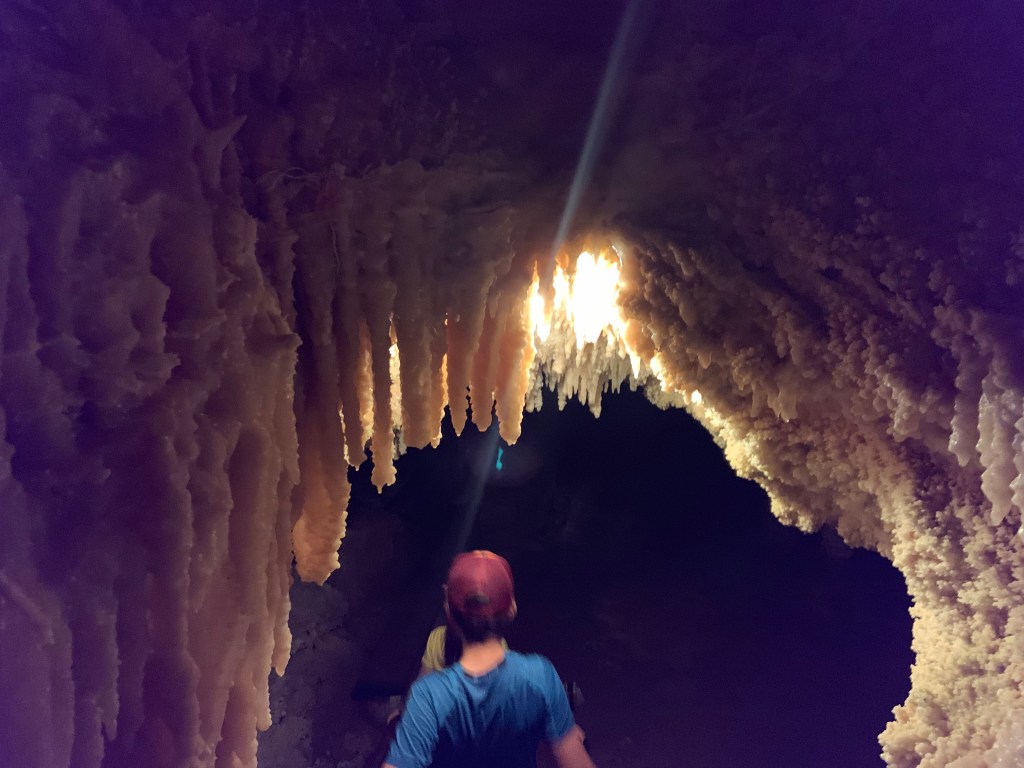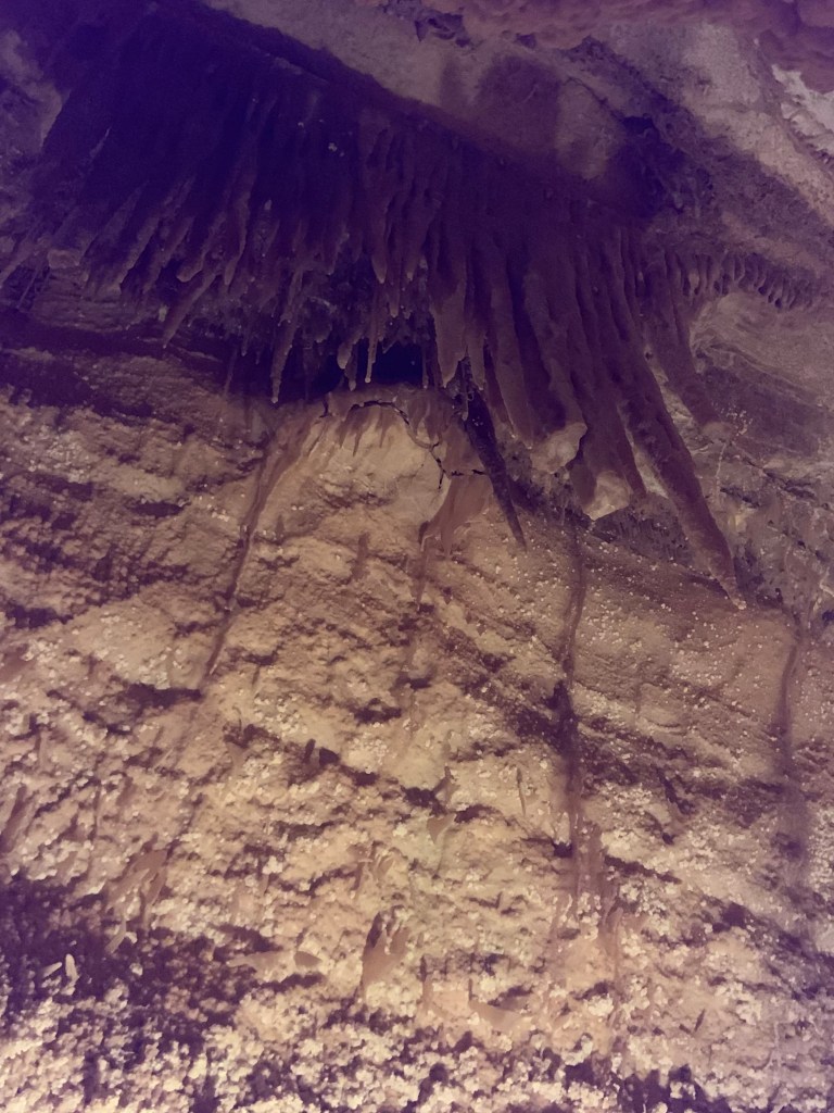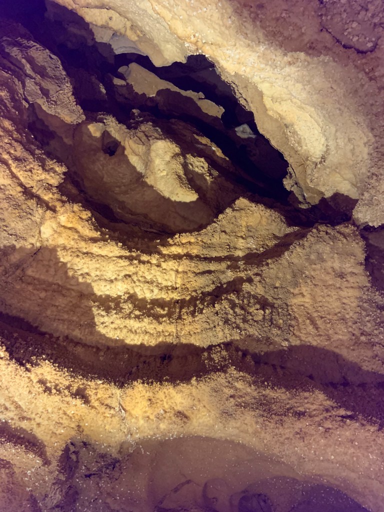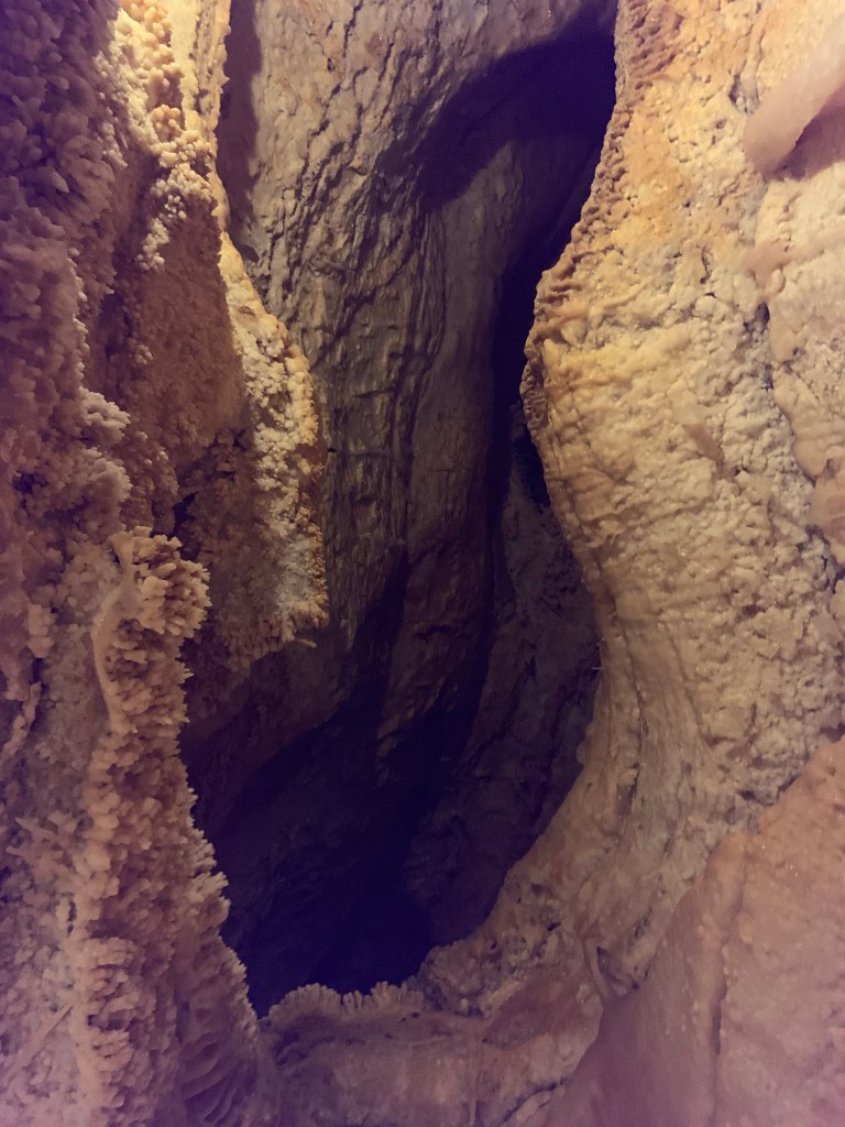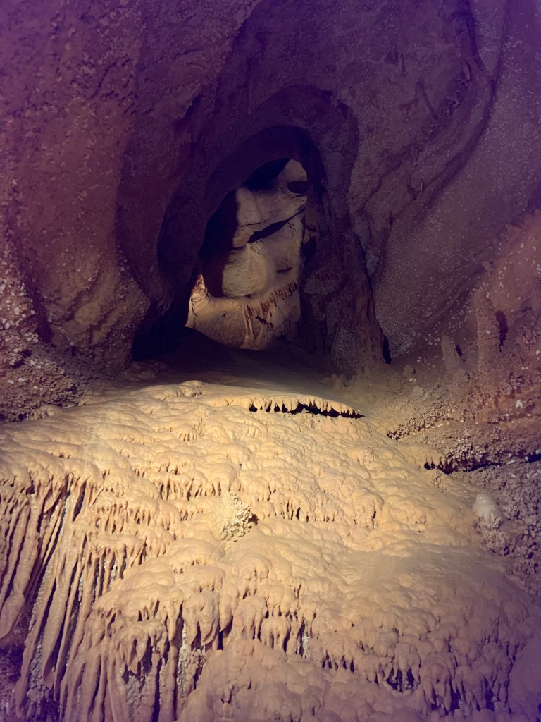 On this tour, the kiddos saw totally different formations than the other two caves and frankly, in a much more personal and intimate setting. Our guide knew her geology; the calcite triangles that seemed to defy gravity growing every which way, the butterfly, soda straws, applesauce, shell impressions, and a whole room full of formations that grew under the water with the water line to prove it. The entire cave was a sea bed at one time. We descended about 150 feet and then climbed back up again. Enjoy the pictures- it took millions of years for these formations to be created.