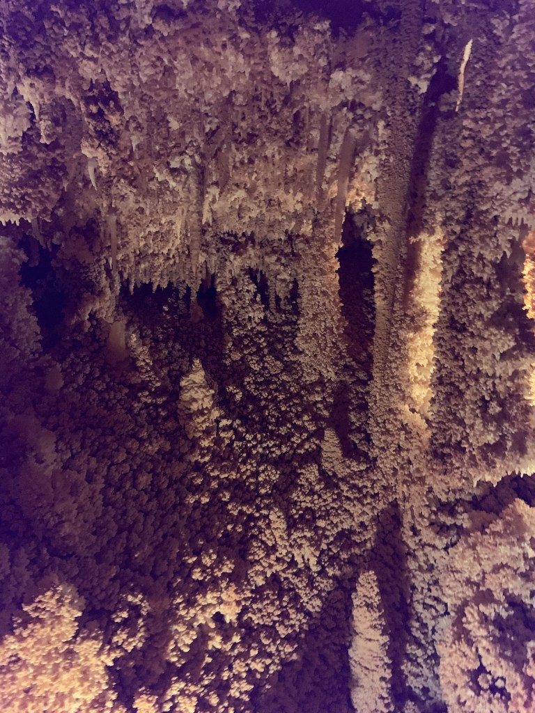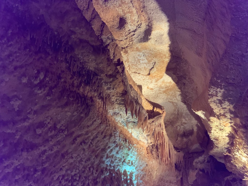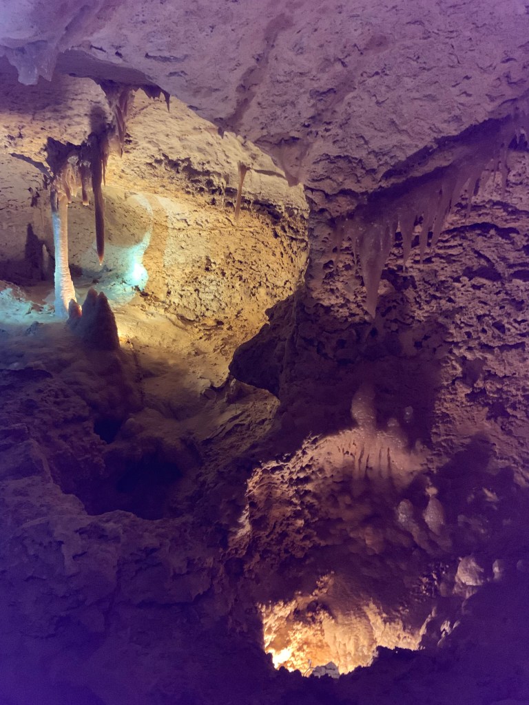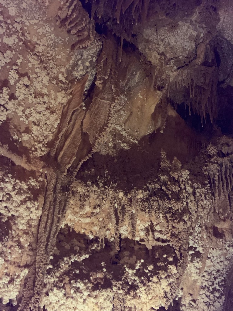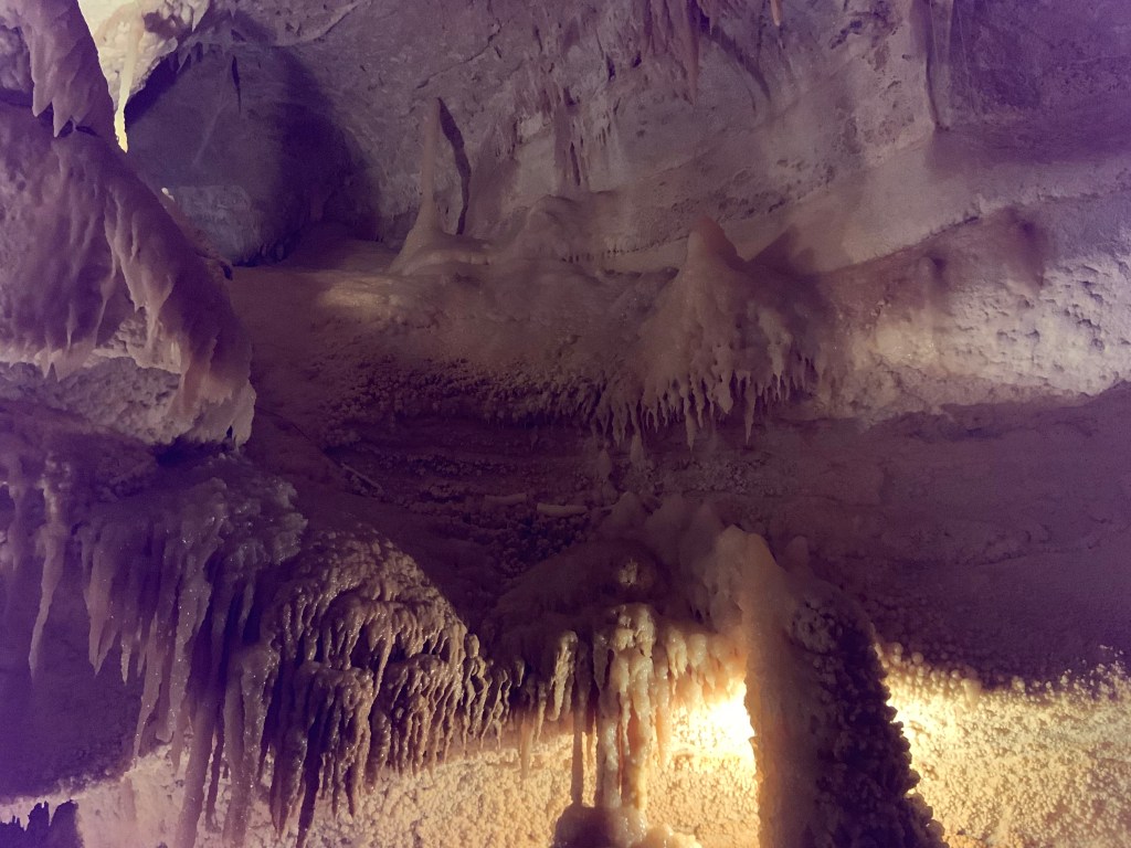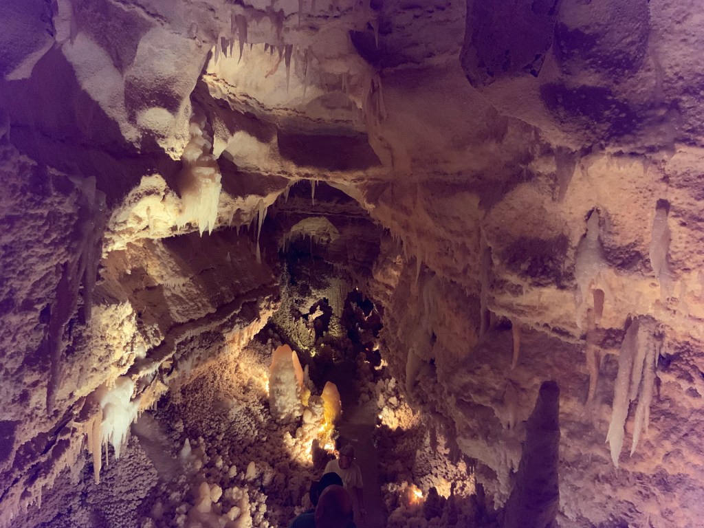 We needed a quick stop over on our way to Austin from Terlingua, otherwise it would have been an 8 hour drive. Sonora Caverns had a brochure at Carlsbad we picked up and then again, someone told us about it in Terlingua, so off we went. I called ahead looking to see if we could get a reservation, but they didn’t take them. FCFS. When we arrived, there was only one or two other RVs there. When we checked in, they had told us that if we had been there just a week earlier, we’d likely not have found a spot- they had a huge group of French Canadians in from Quebec. The Canadians appear to be following us, or rather us following them!