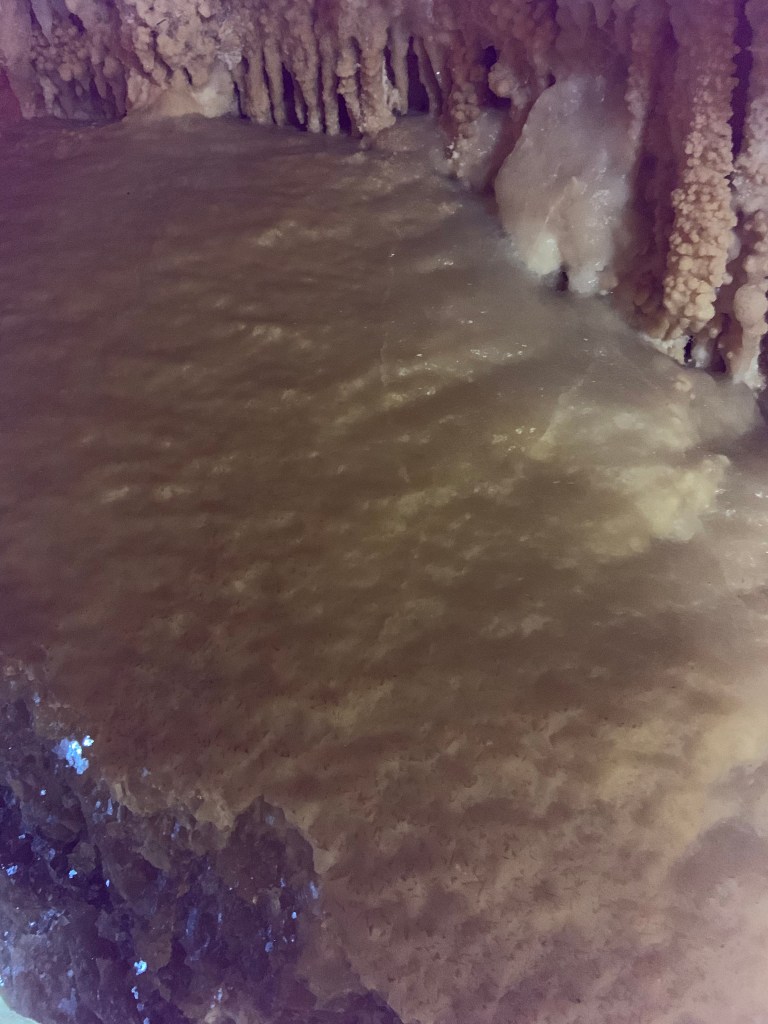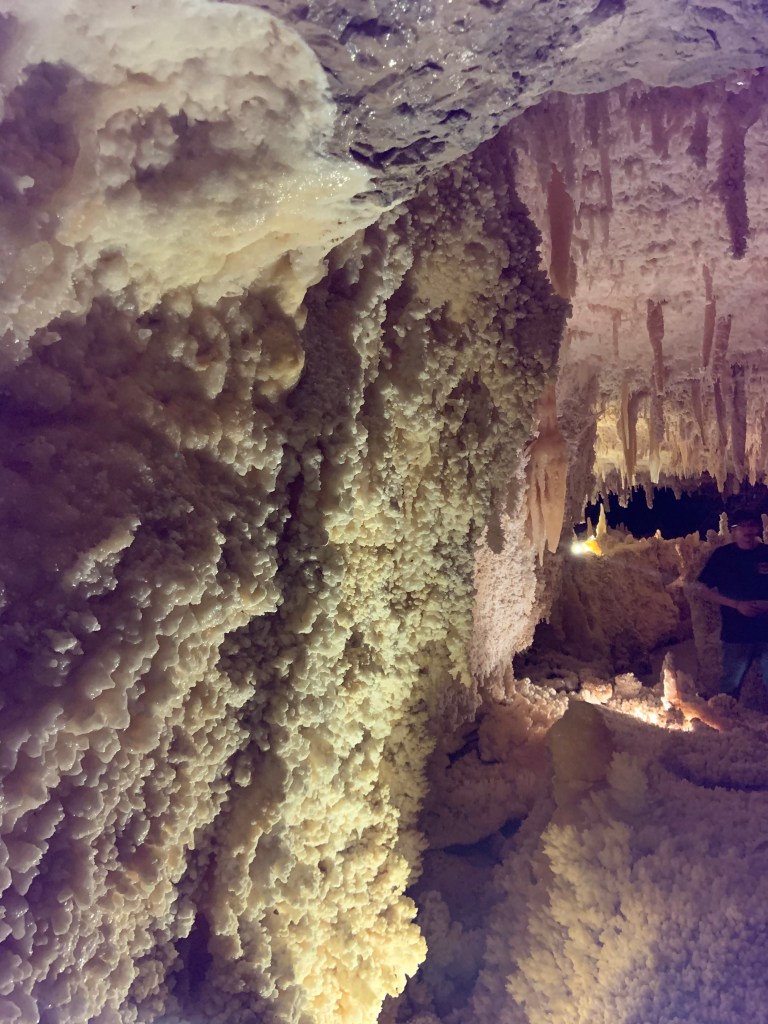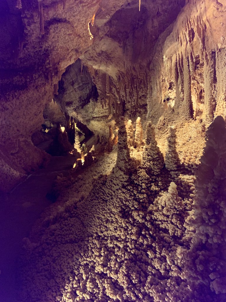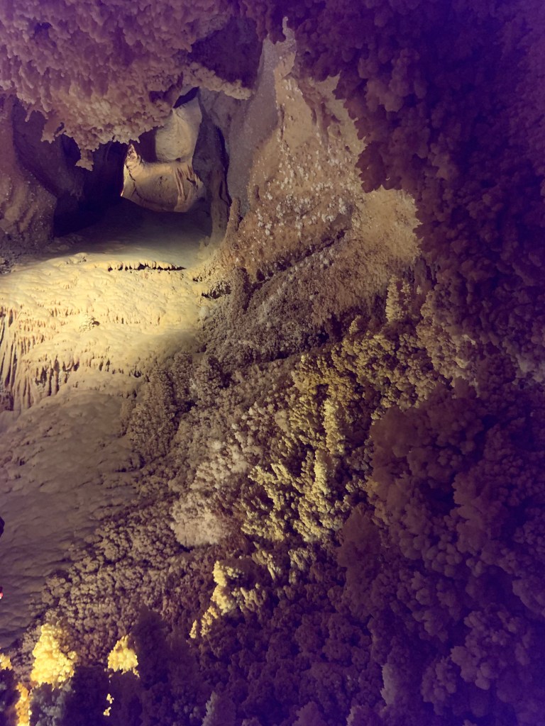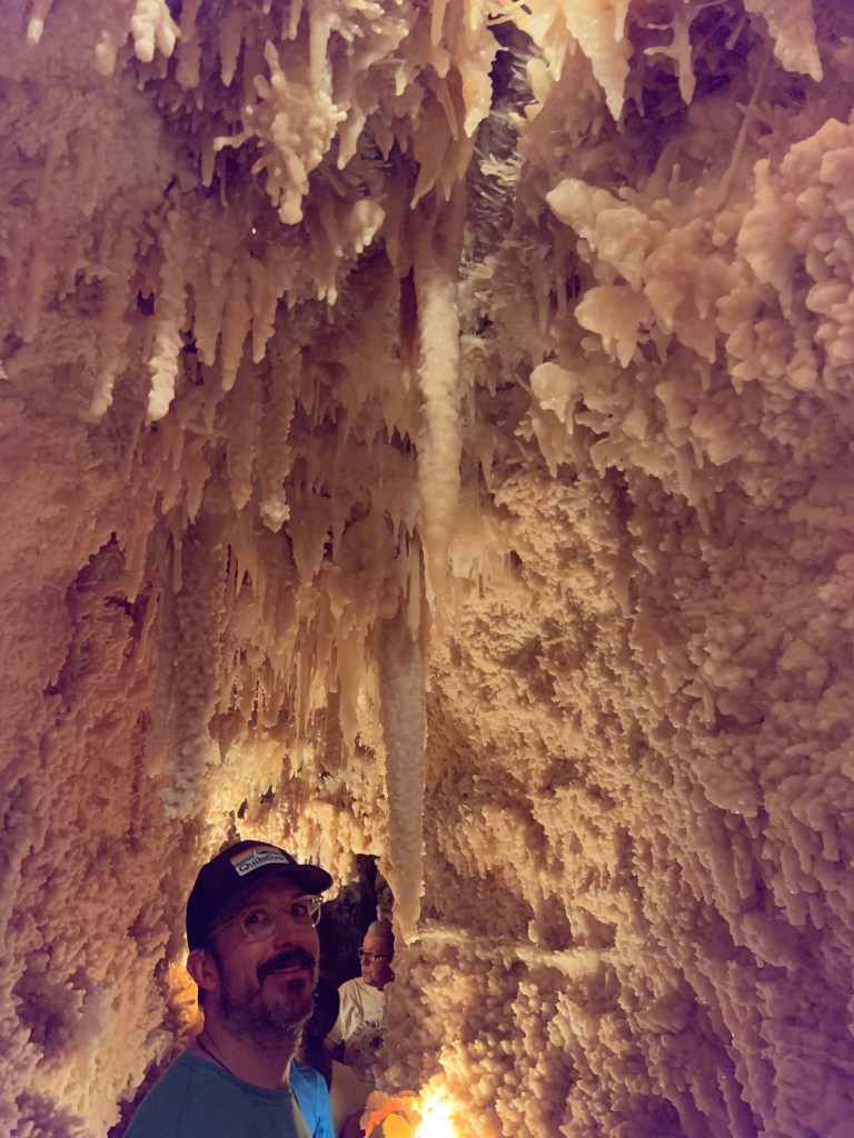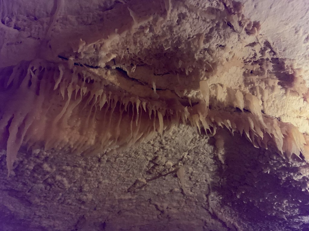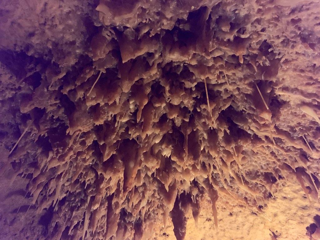 We needed a quick stop over on our way to Austin from Terlingua, otherwise it would have been an 8 hour drive. Sonora Caverns had a brochure at Carlsbad we picked up and then again, someone told us about it in Terlingua, so off we went. I called ahead looking to see if we could get a reservation, but they didn’t take them. FCFS. When we arrived, there was only one or two other RVs there. When we checked in, they had told us that if we had been there just a week earlier, we’d likely not have found a spot- they had a huge group of French Canadians in from Quebec. The Canadians appear to be following us, or rather us following them!
