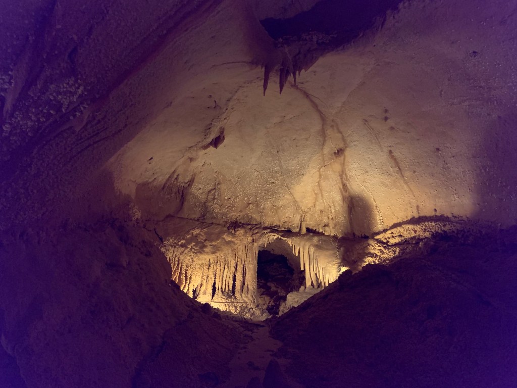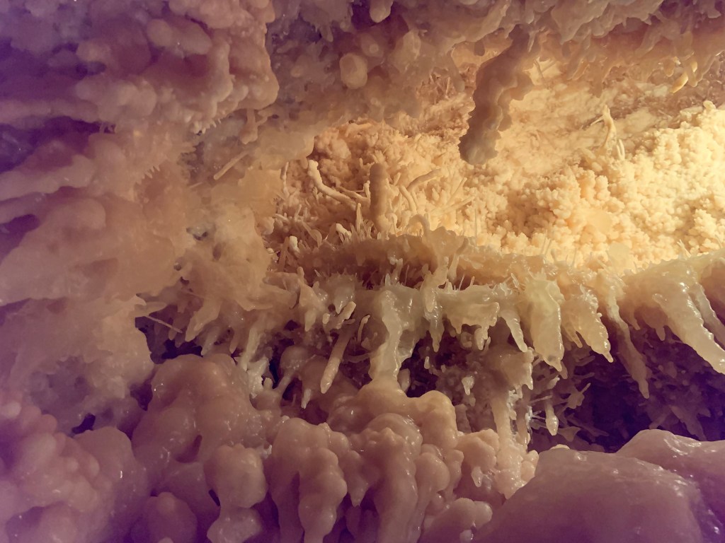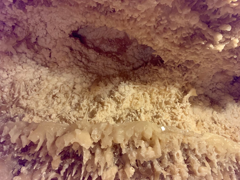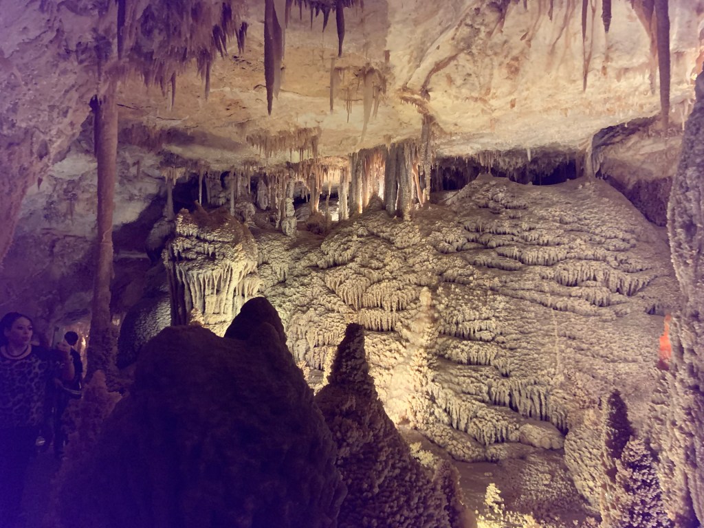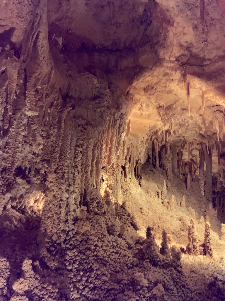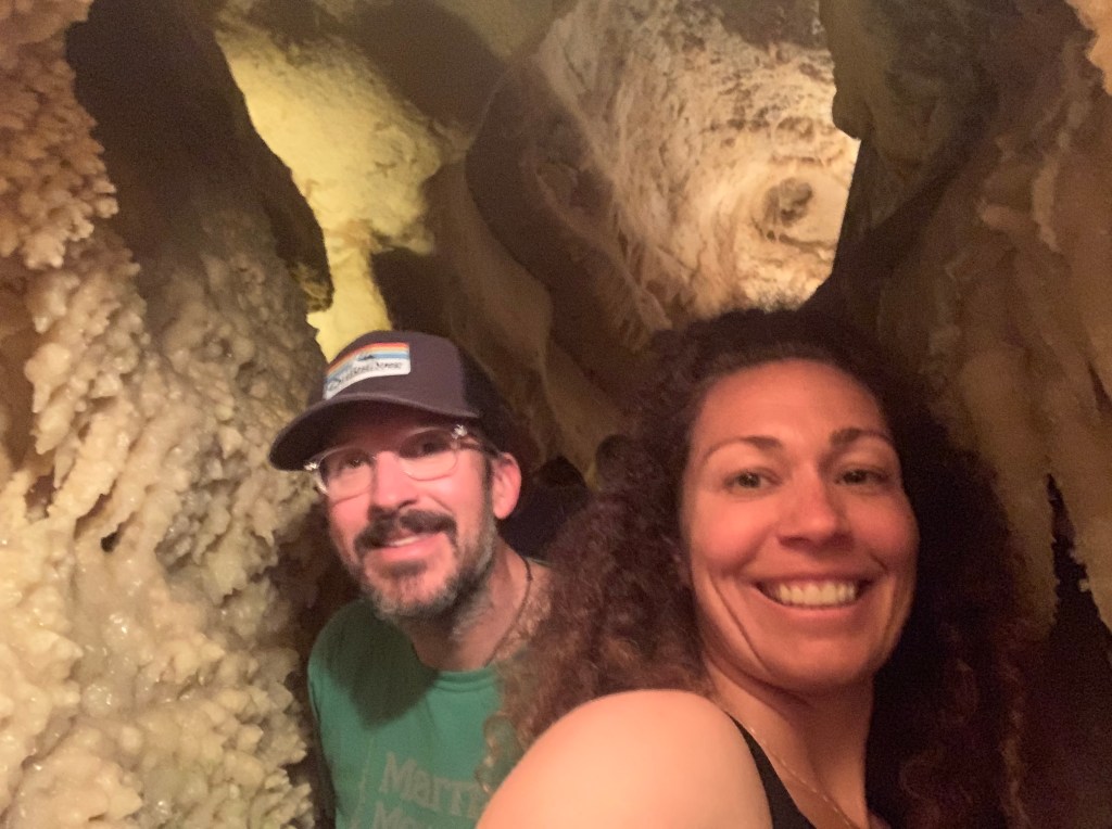 We needed a quick stop over on our way to Austin from Terlingua, otherwise it would have been an 8 hour drive. Sonora Caverns had a brochure at Carlsbad we picked up and then again, someone told us about it in Terlingua, so off we went. I called ahead looking to see if we could get a reservation, but they didn’t take them. FCFS. When we arrived, there was only one or two other RVs there. When we checked in, they had told us that if we had been there just a week earlier, we’d likely not have found a spot- they had a huge group of French Canadians in from Quebec. The Canadians appear to be following us, or rather us following them!