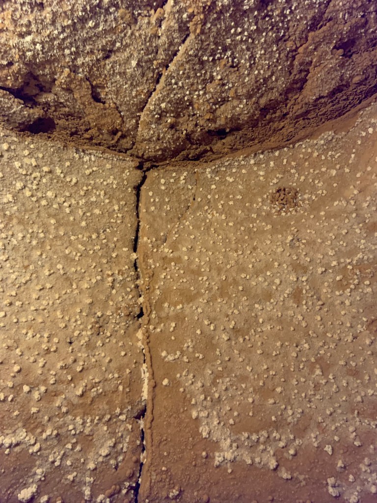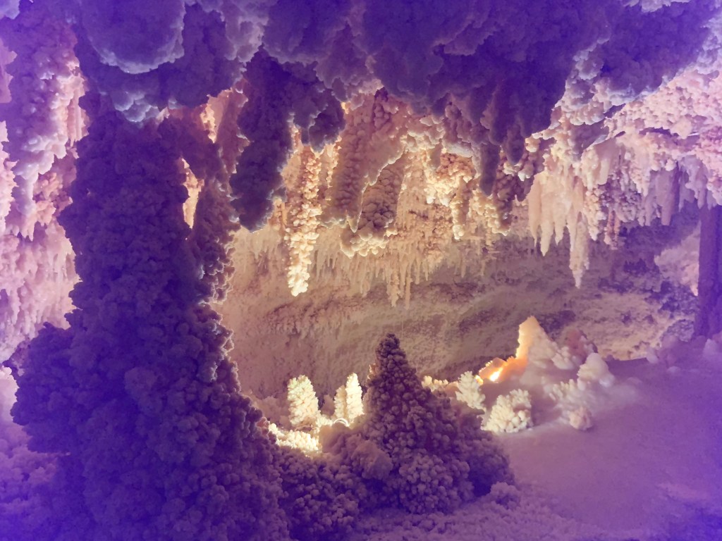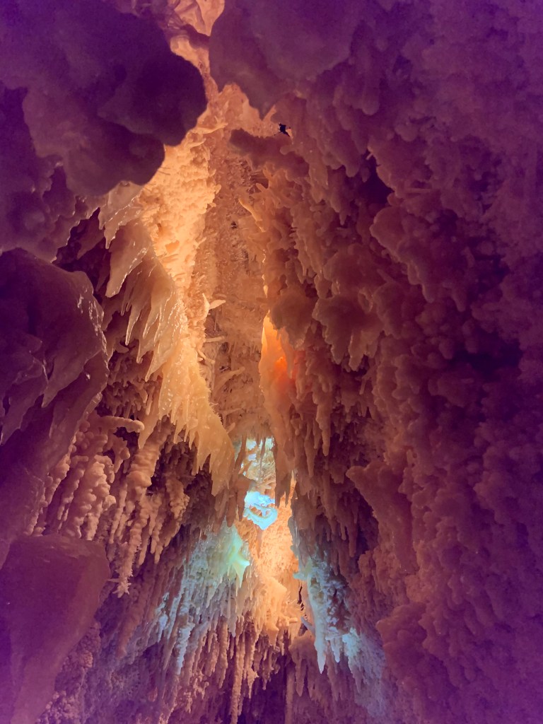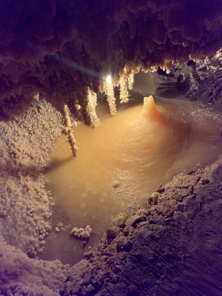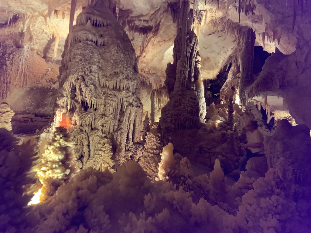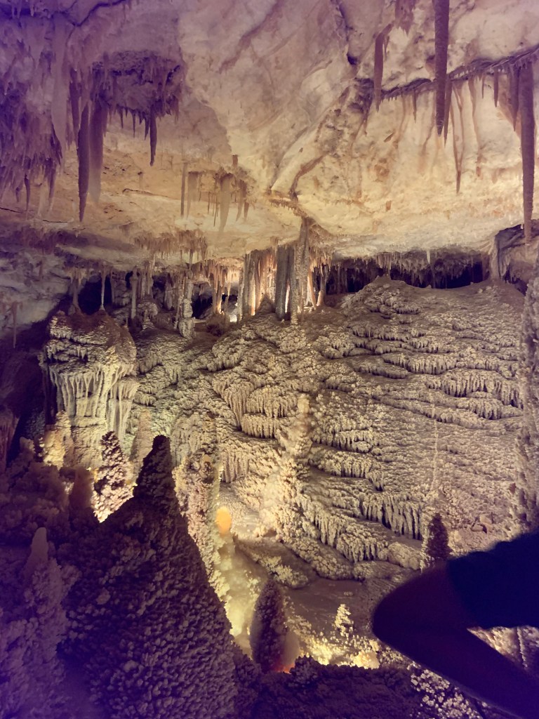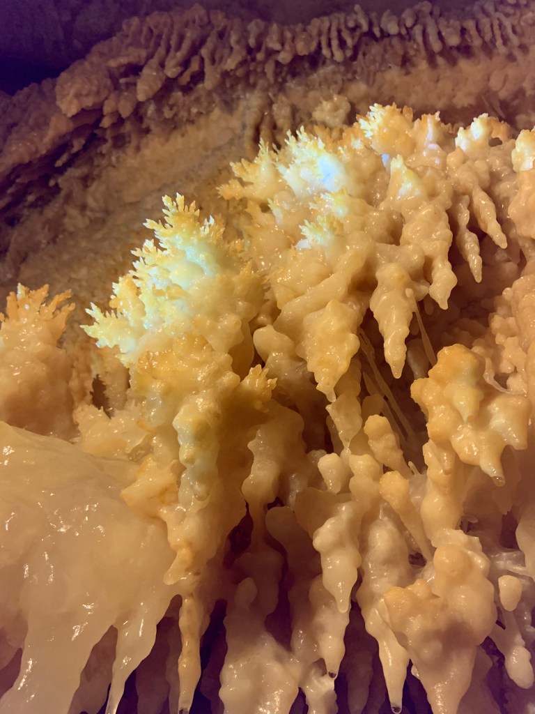 We needed a quick stop over on our way to Austin from Terlingua, otherwise it would have been an 8 hour drive. Sonora Caverns had a brochure at Carlsbad we picked up and then again, someone told us about it in Terlingua, so off we went. I called ahead looking to see if we could get a reservation, but they didn’t take them. FCFS. When we arrived, there was only one or two other RVs there. When we checked in, they had told us that if we had been there just a week earlier, we’d likely not have found a spot- they had a huge group of French Canadians in from Quebec. The Canadians appear to be following us, or rather us following them!