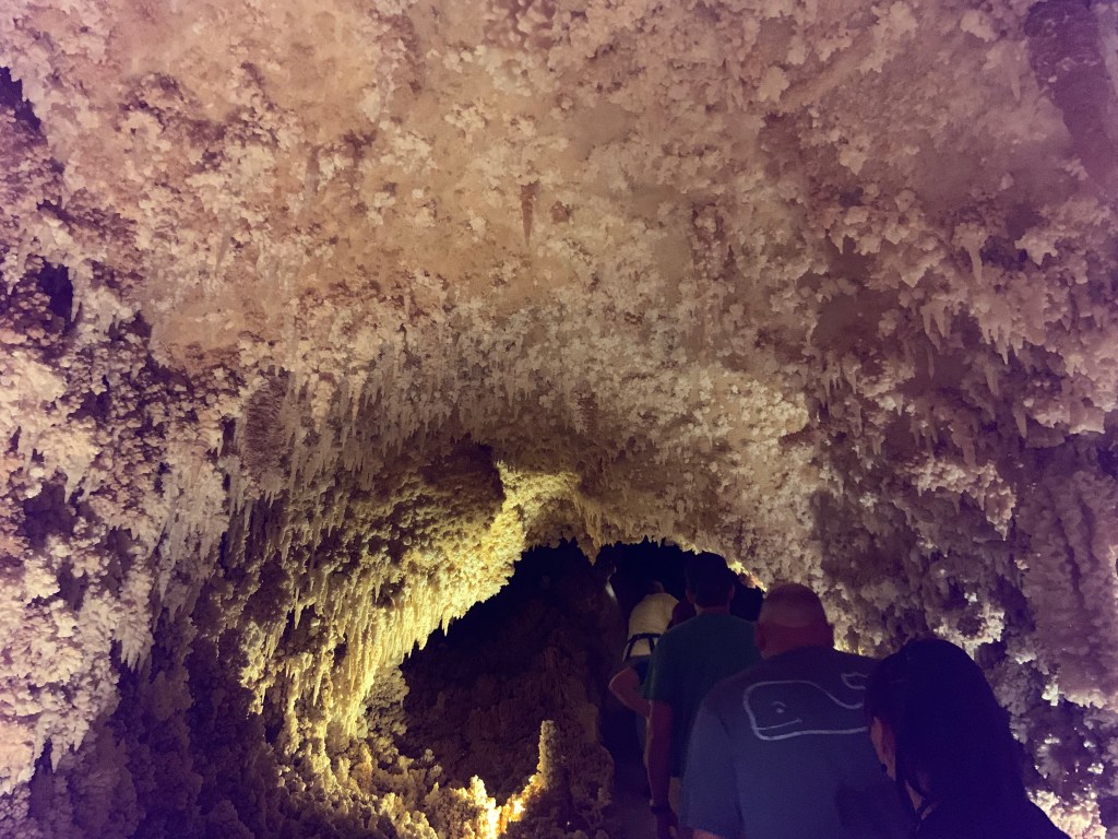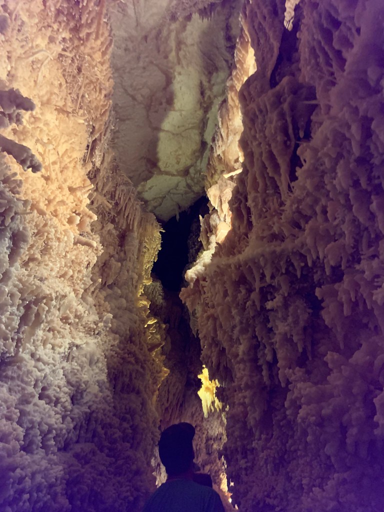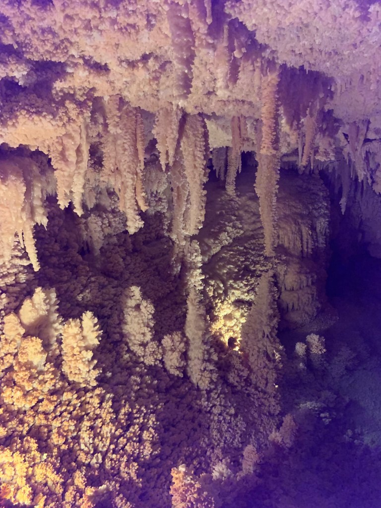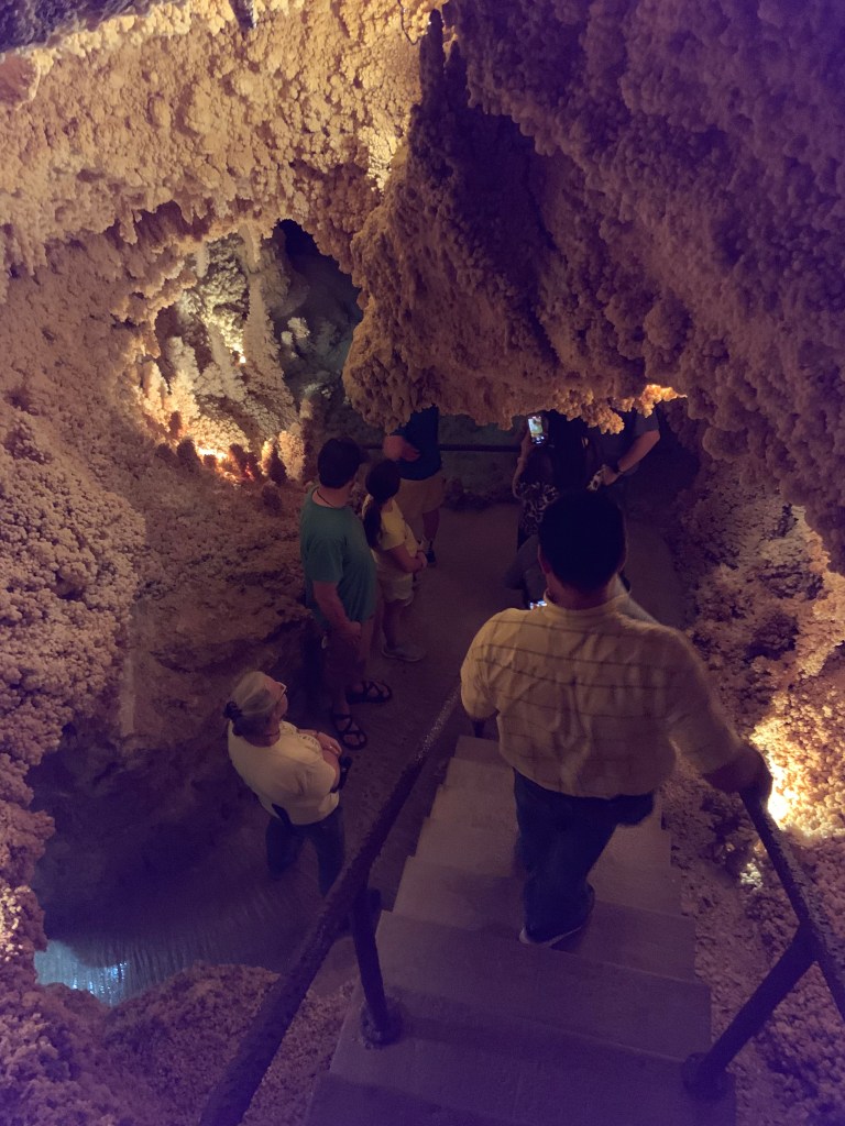 These caves were very different from Kartchner and Carlsbad. The prior two are publicly owned, while this one is privately owned. In a ranch setting with a gift shop and a bunch of peacocks running around, we perused the different gemstones and fun gift ideas. The caverns itself was discovered in the 1920s when a dog chased a raccoon into the 20 inch opening to the surface. We paid for an excellent private tour accompanied by no more than 5 other people.