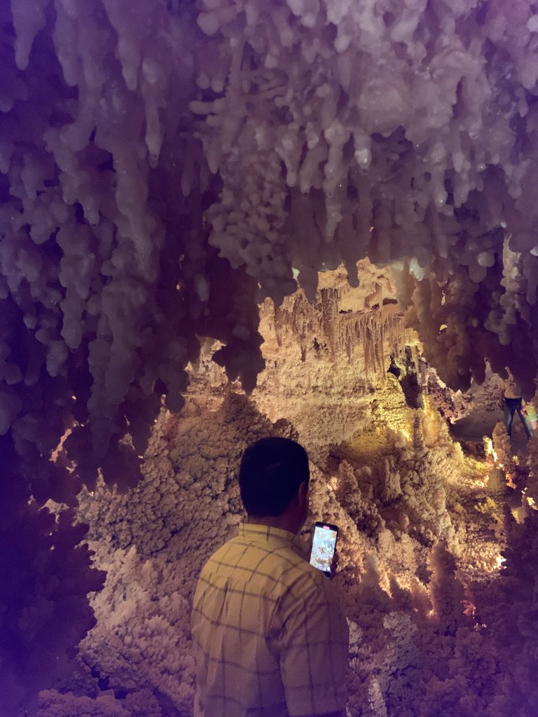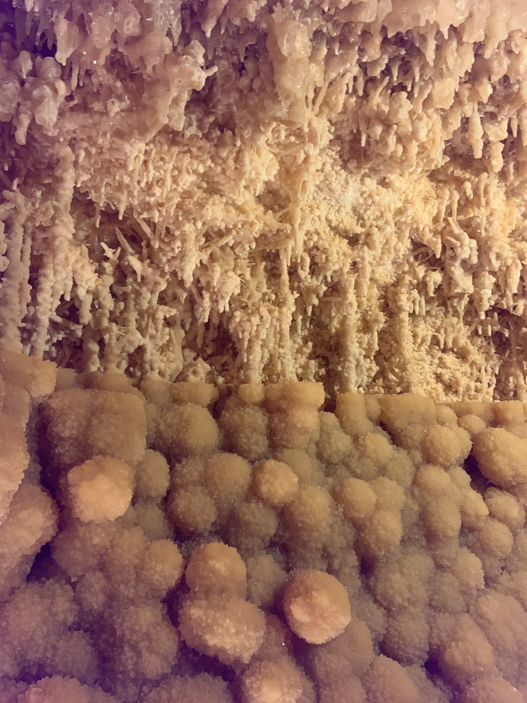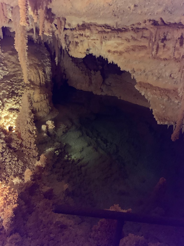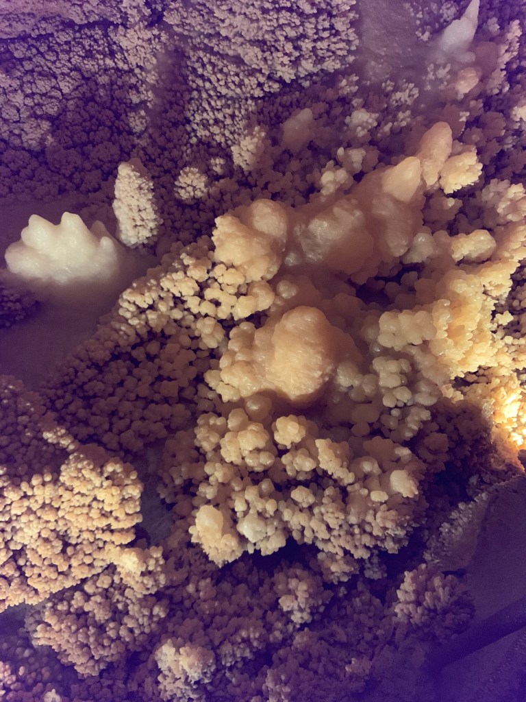 These caves were very different from Kartchner and Carlsbad. The prior two are publicly owned, while this one is privately owned. In a ranch setting with a gift shop and a bunch of peacocks running around, we perused the different gemstones and fun gift ideas. The caverns itself was discovered in the 1920s when a dog chased a raccoon into the 20 inch opening to the surface. We paid for an excellent private tour accompanied by no more than 5 other people.
