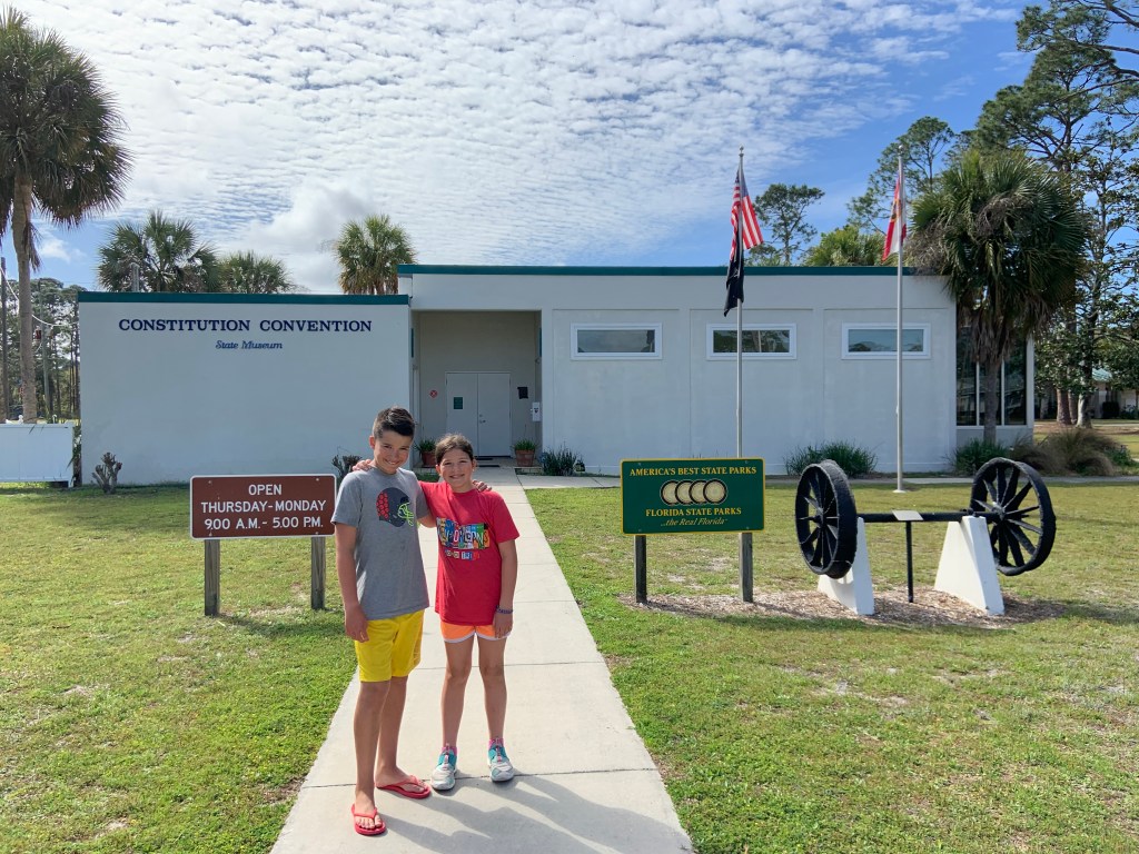 St. Joseph has quite the remarkable history. The kiddos and I received a personalized tour from Florida State Park Ranger Joanna Lindsey, who manages the Constitution Convention State Museum located just off of Highway 98. What a sweet lady! She gave the kids their own copies of the constitution and quills! She also let them in behind the scenes to take a picture! Port St. Joe was actually founded as St. Joseph, or “the lost city” back in 1835. Well, actually, they are two separate towns founded about 2 miles from each other and about a century apart. The story goes…..