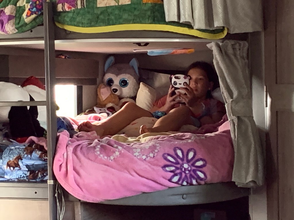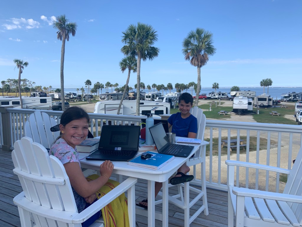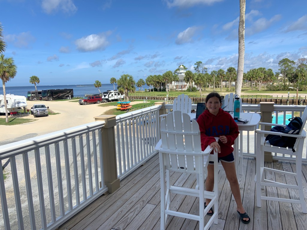 The kiddos and I do school on the second floor of the clubhouse overlooking the bay. We tried doing it outside at the picnic table, but the Wifi signal wasn’t quite strong enough for the video lessons and streaming. So, instead, each morning we head out with a towel and wipe down the outdoor furniture from all the dew, then spray it down with cleaner. Then we spray ourselves down with bug spray to keep the darn no-see-ums away! With no Spring Break to really ‘take’, the kiddos and I kept to the same schedule and they have gotten about a week ahead on school. I expect them to finish everything by the end of May, which will be great timing. I really hope we can resume our trip up the East Coast to North Carolina before we head back to Oregon in July.