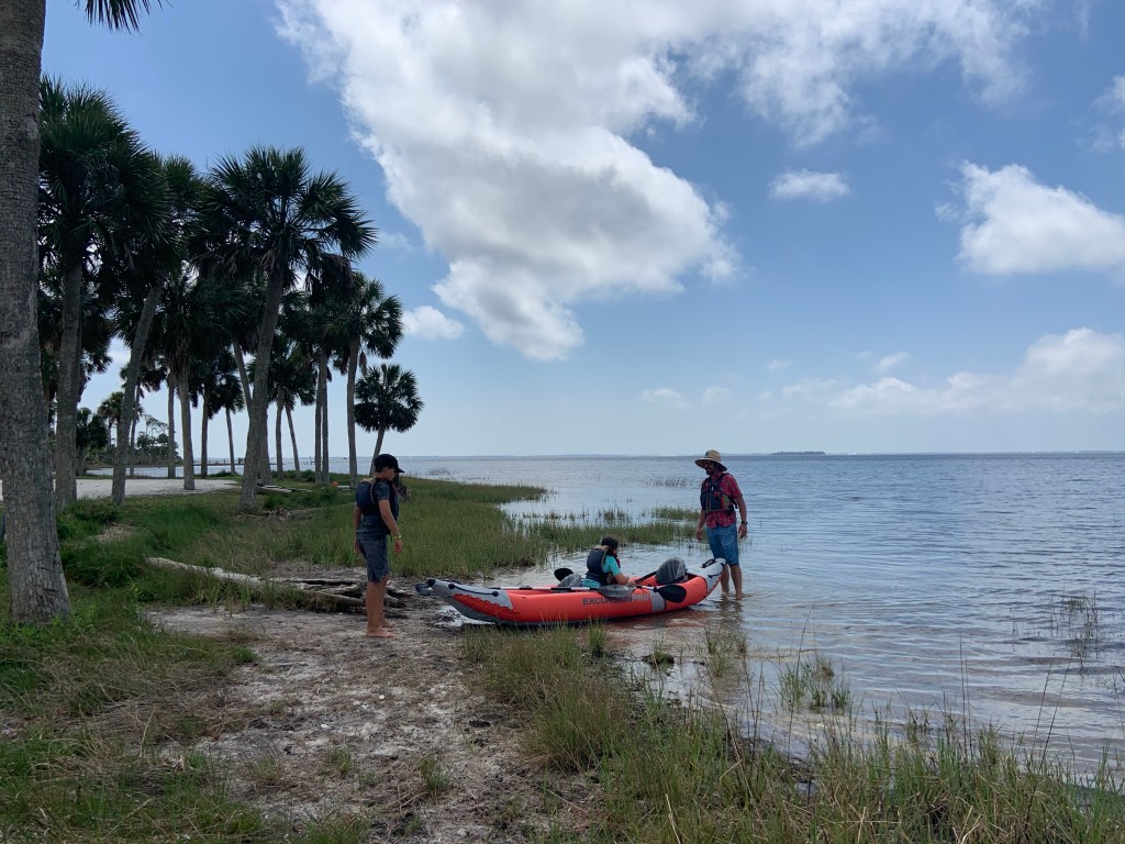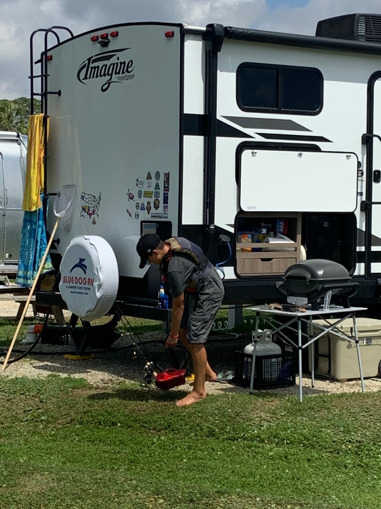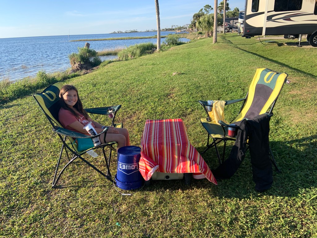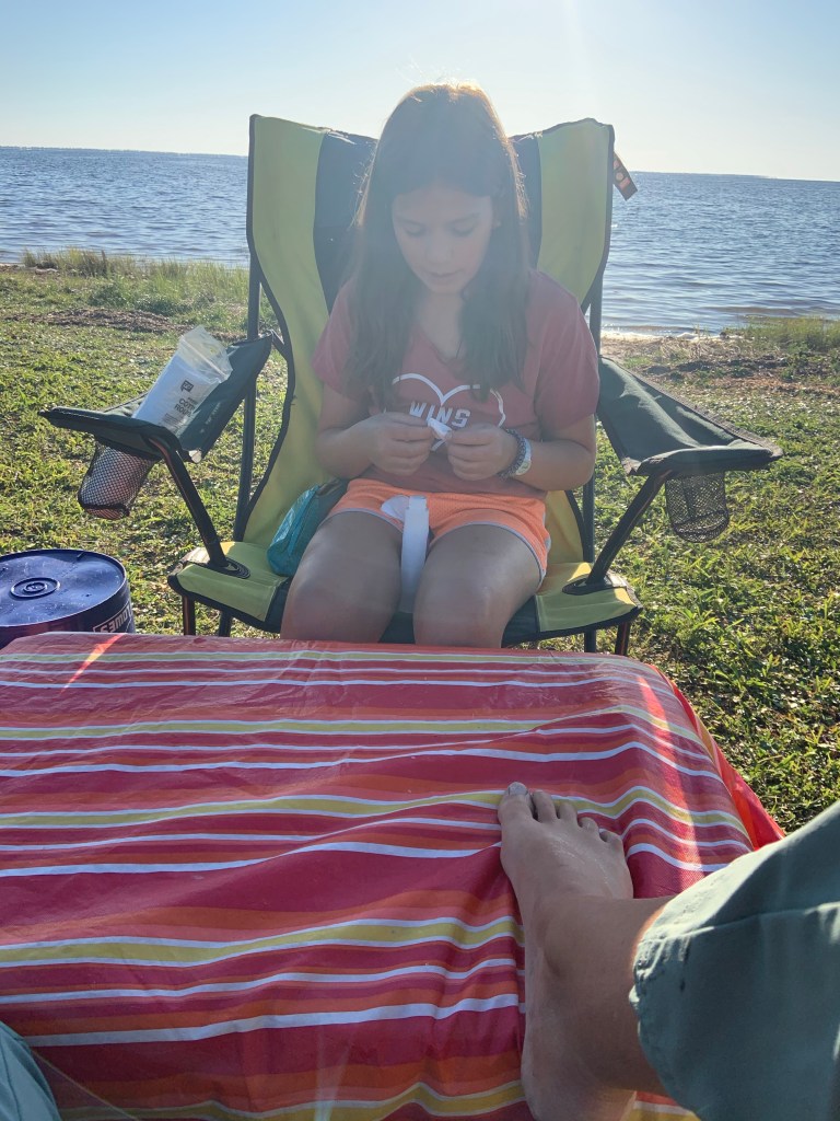 We ordered two inflatable tandem kayaks and some PFDs from Walmart about a week ago and they arrived as we were starting to get a little cabin fever. We have been fishing pretty much every weekend for 5+ hours per day. We’ve got other campers who are doing the same and sharing tips. We especially like the paddle footed electric chicken bait! Ben made us two anchors with his paracord and bricks we found along the beach. Izzy picked up a fishing rod this week, complete with a teal/blue accent to the rod and is bound and determined to catch us dinner!