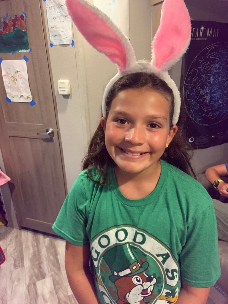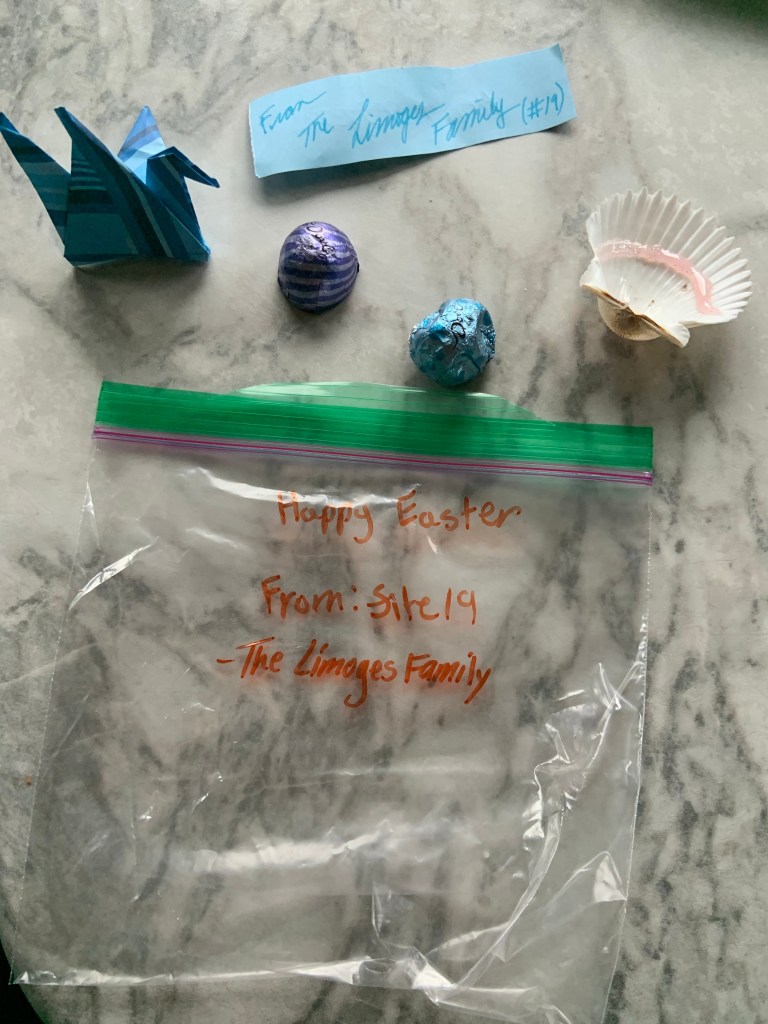 How was your Easter Sunday? Izzy decided that we really needed to still have Easter and that everyone at the park needed to know that even if they weren’t celebrating with their loved ones, they were special to us. She and I set off to make 40 little Easter Goody Bags for those campers who were stuck like us. Each baggie had a clam shell with a piece of corral hot-glued inside with super sparkly glue colors along with a little ‘Happy Easter’ note and an origami bird. She finished each bag off with 1-2 little Dove Chocolates. We delivered all of these on a windy, Sunday morning. Izzy had her light up egg necklace and light up ears too. When no one was home, we simply took a little painters tape and found somewhere to tape them down that the campers would see them when they got back. What we didn’t expect was how folks reciprocated. Steve brought us frozen snickers bars (he just had lung surgery to remove cancer and is high risk), Dan and Debbie gave Izzy a bunch of shells and a few plastic chick eggs and a bucket, she received Kit Kat bars, thank you notes, and the list goes on and on. It really warmed our hearts to hear how much it warmed the hearts of others. Hey, if nothing more, it’s an excellent lesson that love works and connecting with others can be done in so many different ways. Dan and Debbie shared in the joy of watching the kiddos search for eggs that the Easter Bunny had left for them that morning.