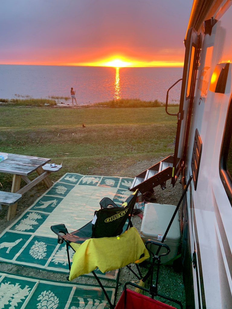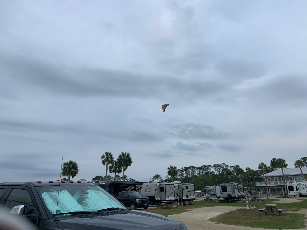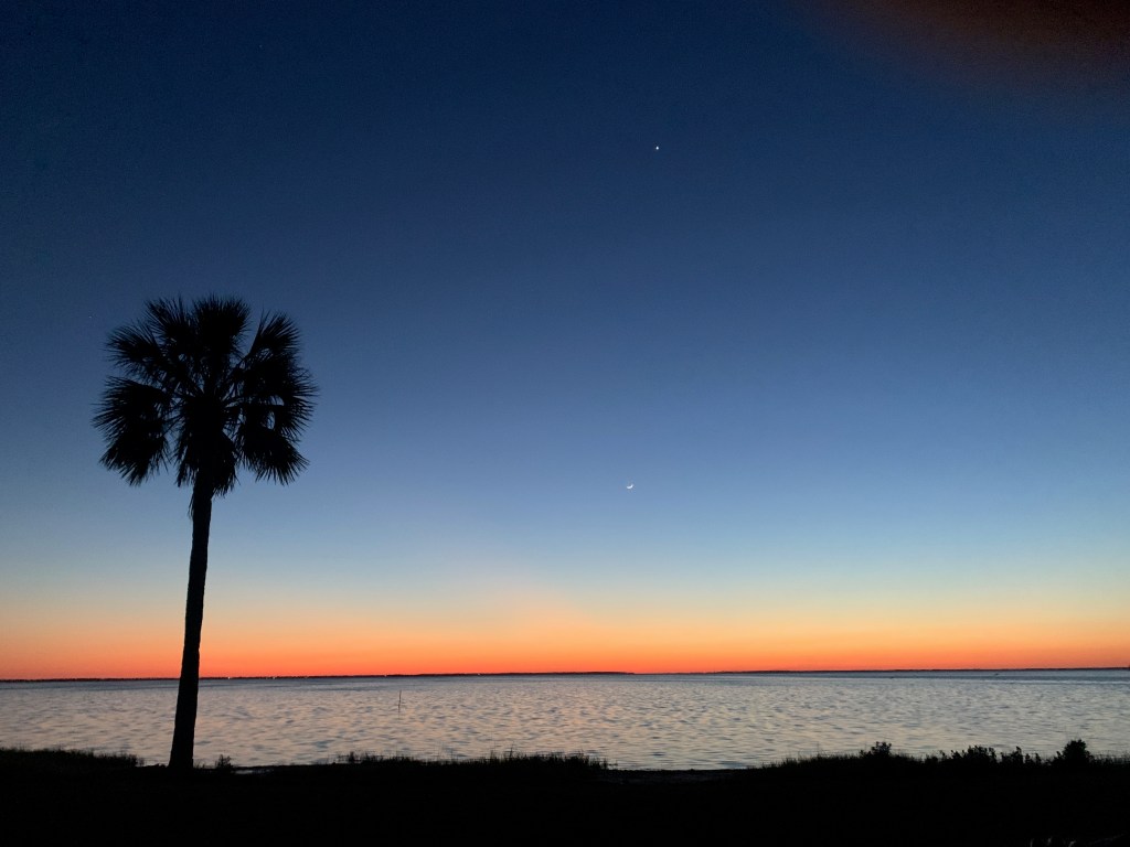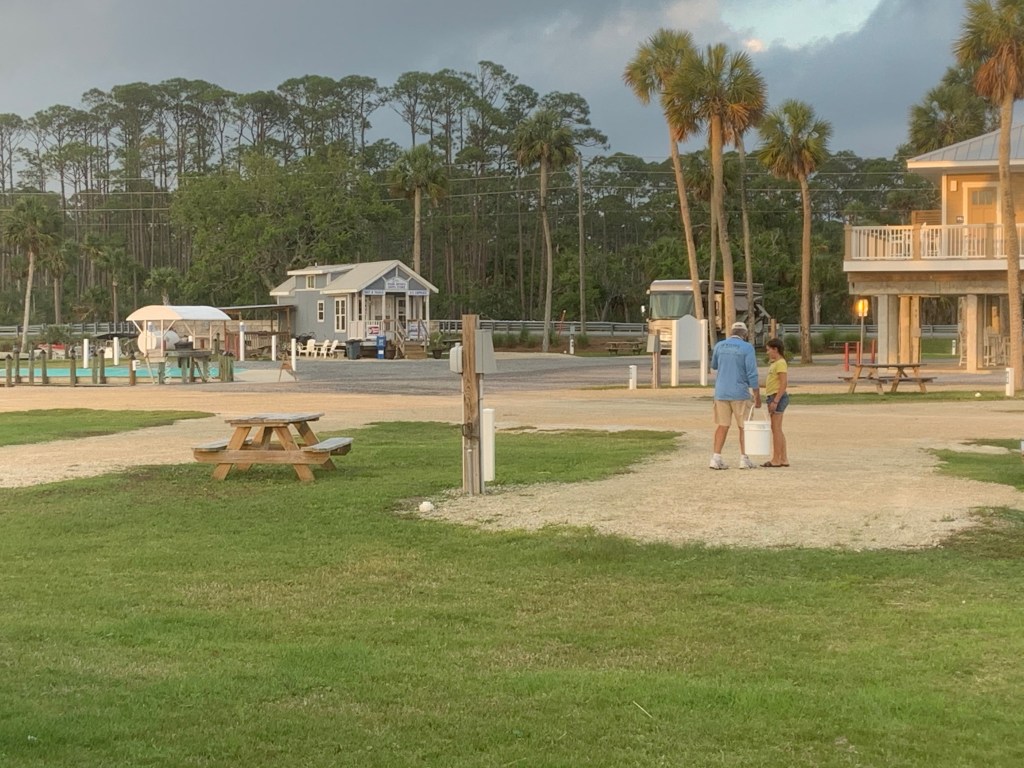 Another dimension to our trip that hasn’t been expected is the weather. The water (and air) in the Gulf is warmer than it’s ever been for this time of year, which means more opportunity for tornadoes and much earlier than usual. We had our first tornado watch as well as our first 50+ mile gust hit the camper. We didn’t sleep a wink. I don’t have the stomach for it, nor does Clark. We do know that the employees at Presnells keep the clubhouse open when big storms come through. The clubhouse survived Hurricane Michael, which was a category 5 storm. When I’ve asked the locals about the storms we have, they say, ‘oh that? that’s just a gust’. Oy vey!!! I did have some folks also teach us the value of our location along the cape. St. Joseph Bay is pretty well protected from storms coming in off the ocean because the water is that much more shallow. The storms lose much of their energy once they break through the cape and are more often than not pushed northwest to Mexico Beach. Still, I’ll take fires, volcanoes and snow any day over hurricanes and tornadoes. And for now, I’ll take the Florida Sunsets (w/o the bugs!)