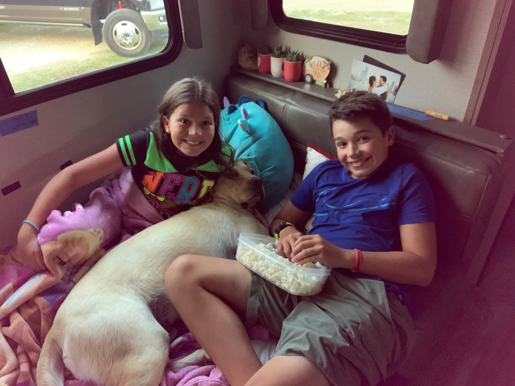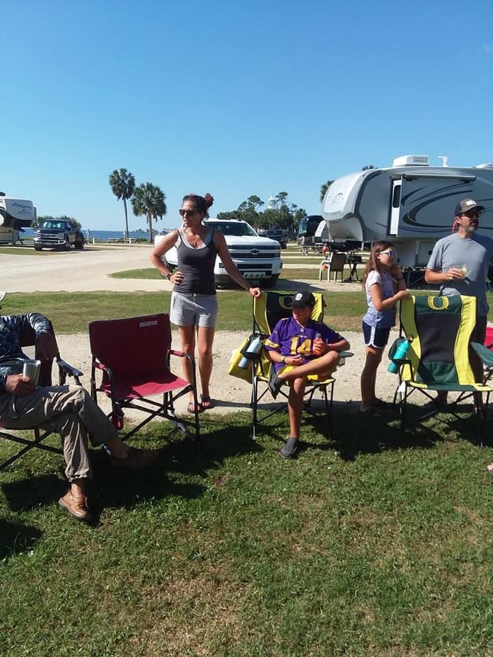 Our next adventure was our BBQ with Mark, Barb Seuss and Smitty. After being socially isolated with everyone for 4 weeks, we needed little bit of sanity and to do something ANYTHING that allowed us to connect with PEOPLE in person. Barb and Mark are from Tennessee and they smoked some absolutely AMAZING ribs. We all sat around together and shared a meal. We also handed off a bottle of King’s Estate Pinot Gris and another bottle of Kettle One to Seuss and Smitty as a thank you – Smitty had gone fishing one day and caught so much trout and red fish he decided to share a gallon bag full of fillets with us. It fed our family for two nights! It was so wonderful to share some laughs and give each other a little bit of normalcy complete with cocktails, stories, great eats, big laughs, smooth country music and some good ol’ fashioned sunshine. With only 3500 people in our entire county and one confirmed (and not hospitalized) case of the virus and everyone in great health for 4 weeks socially distancing, we decided we would take our chances on our local RV family for some socially distant din-din.