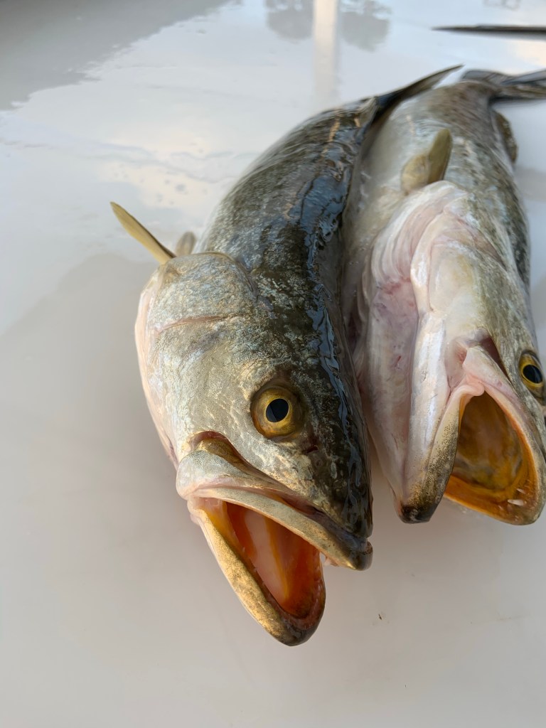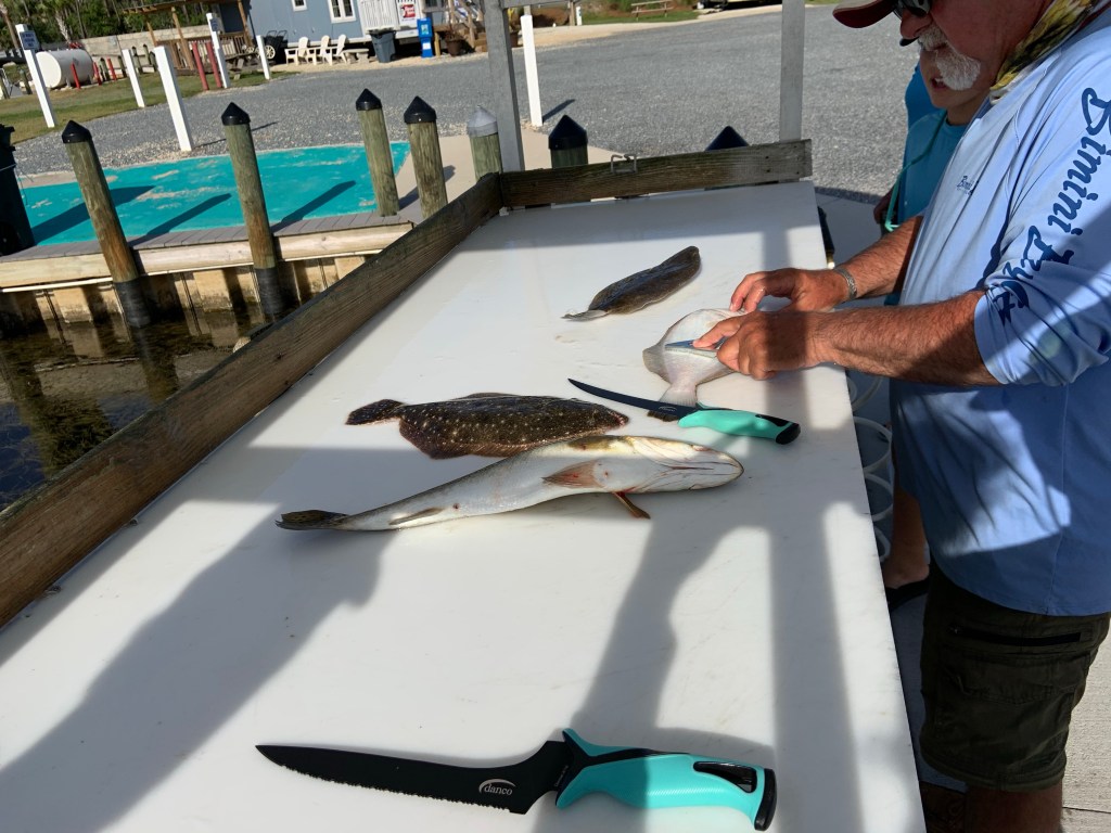 Presnells has a popular marina and Izzy, Ben and I had been coveting all the fish the guides and fishermen were bringing in each day. They’d filet them right at the cutting table off of the marina. Clark has taken to kayaking out early on the weekends. He caught a few brown trout and we cooked them up for dinner. Clark also gave me a hall pass and let me fish with Smitty again for a few hours in the evening. Caught two trout!