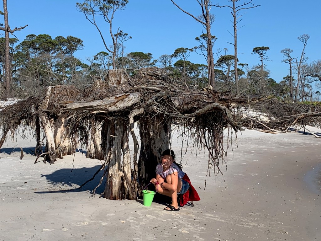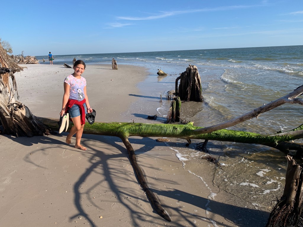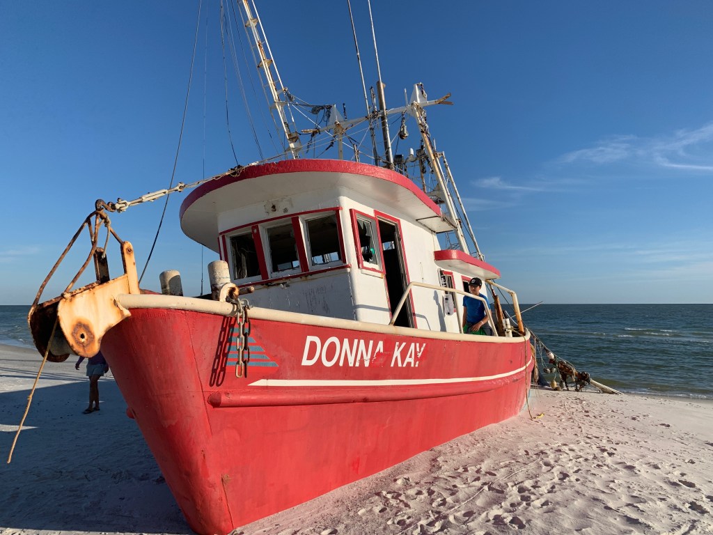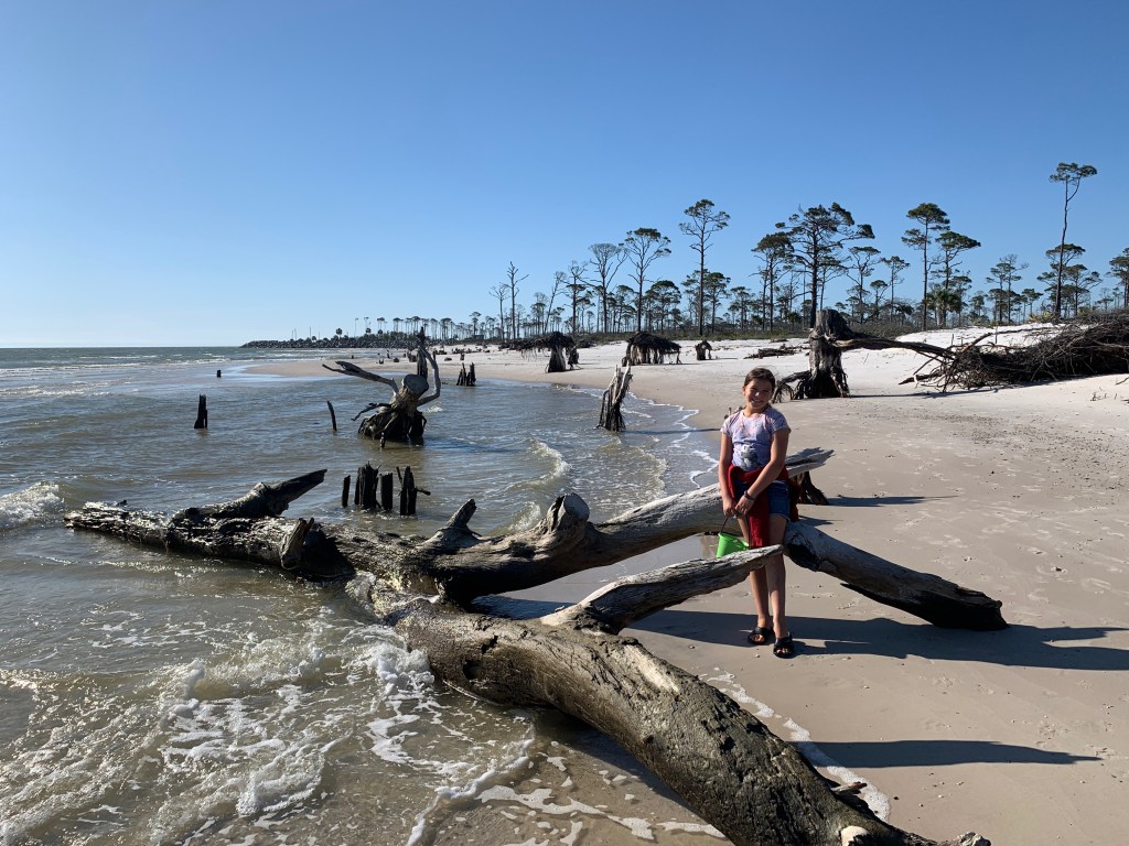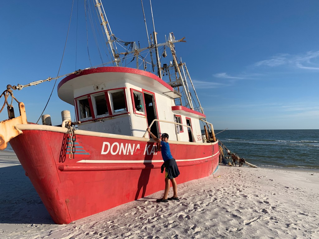 The beaches were officially opened on Friday, April 24th and folks were allowed to go to them daily between 6-9am and 5-8pm. Still, it’s pretty ironic to us that there are any restrictions at all. We are in the ‘Forgotten Coast’ and it’s name is fitting- there’s hardly anyone around. We headed out to do some shell hunting and to walk the 1.1 miles to the beached shrimp boat and only saw 4 other folks. Hurricane Michael came through PSJ about two years ago and there’s still significant rebuilding going on. One of the major aftereffects of the Hurricane was to Cape San Blas and the beach there. About 200 yards of beach, going into the adjacent forest was sucked back into the ocean. Twisted tree trunks are all that remain and the tide has come in far closer than it ever did before.