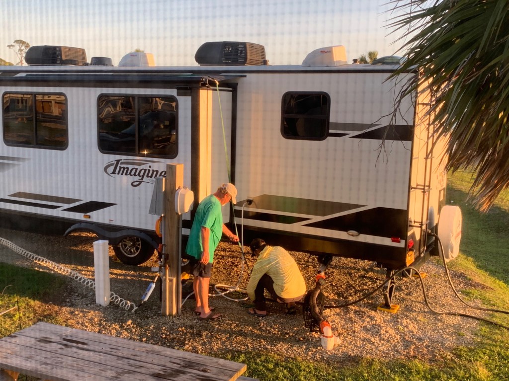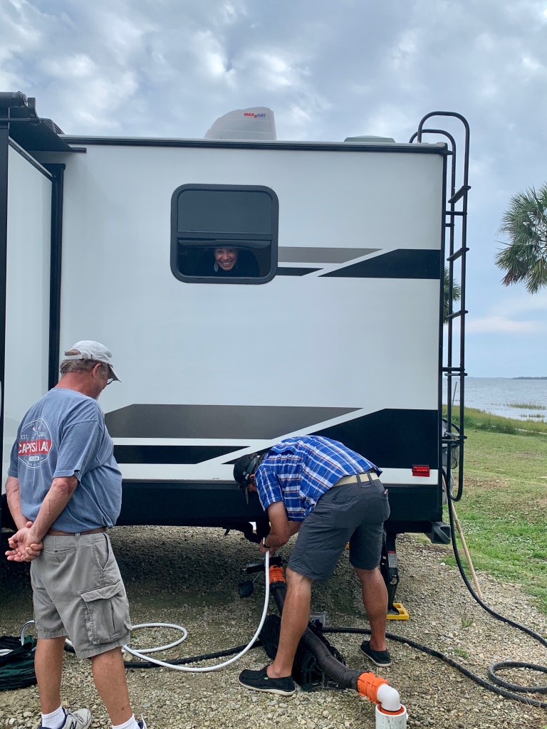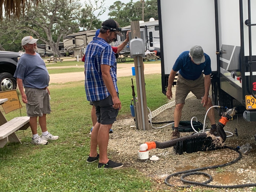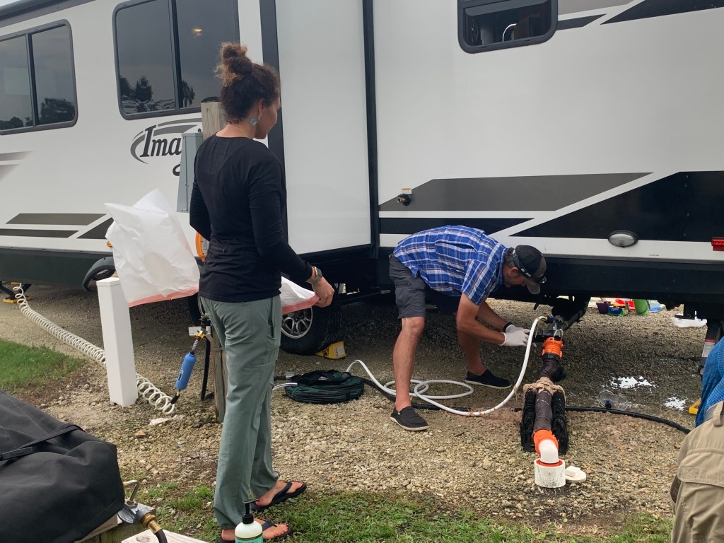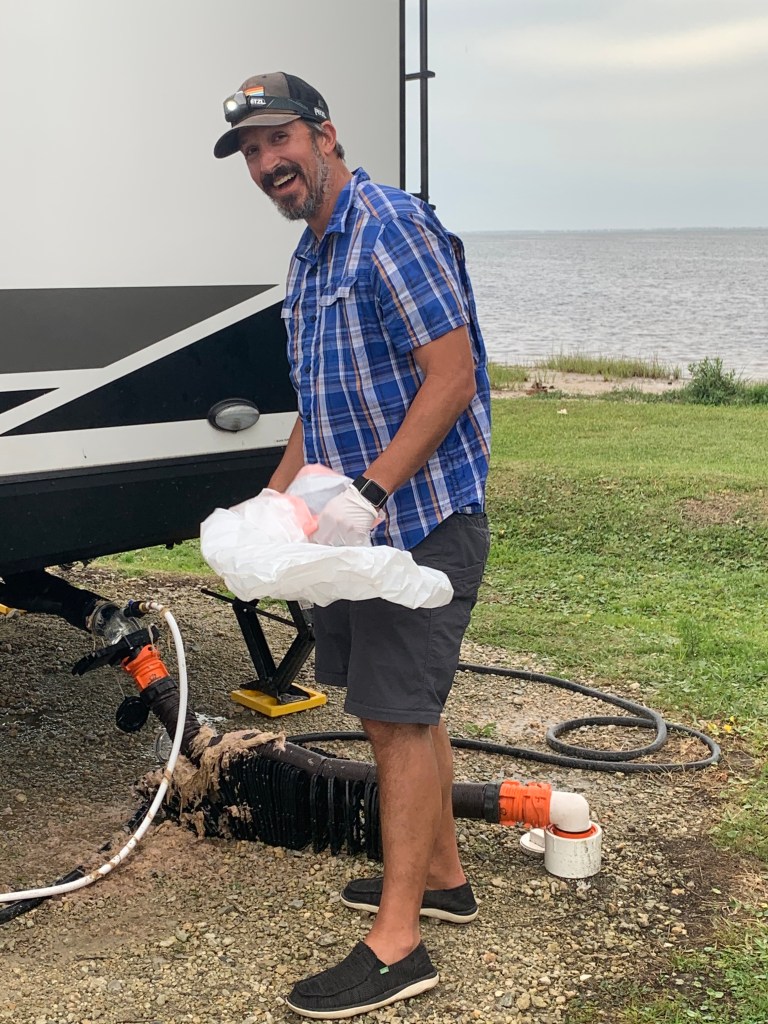 And of course, one can never have an RV without a black tank fiasco. Let’s just say that these first time RVers learned the hard way that toilet paper needs plenty of water to break down sewage. We had a TP pyramid blockage of the ages. How many RVers does it take to clear a blocked black tank? Apparently 8. 1 to make a mistake, 2 to clean it up, 1 to document the entire event and 4 there to laugh and offer moral support. Welcome to our RV life! Rainbows, sunshine and black tanks, oh my! The faint of heart may want to skip these photos. The shots of me in the ocean are from cleaning our hose support. The ocean giveth and the ocean taketh away!