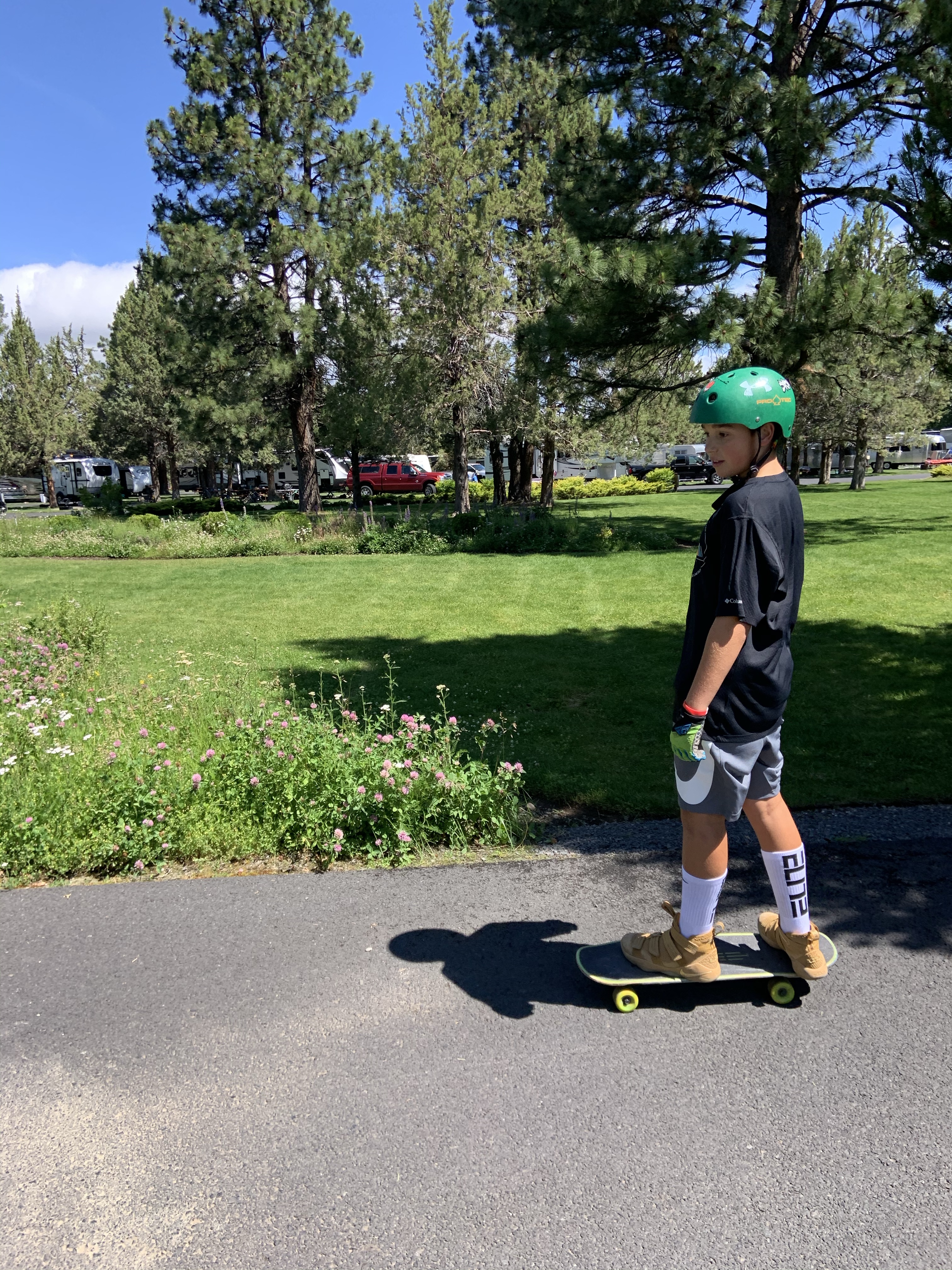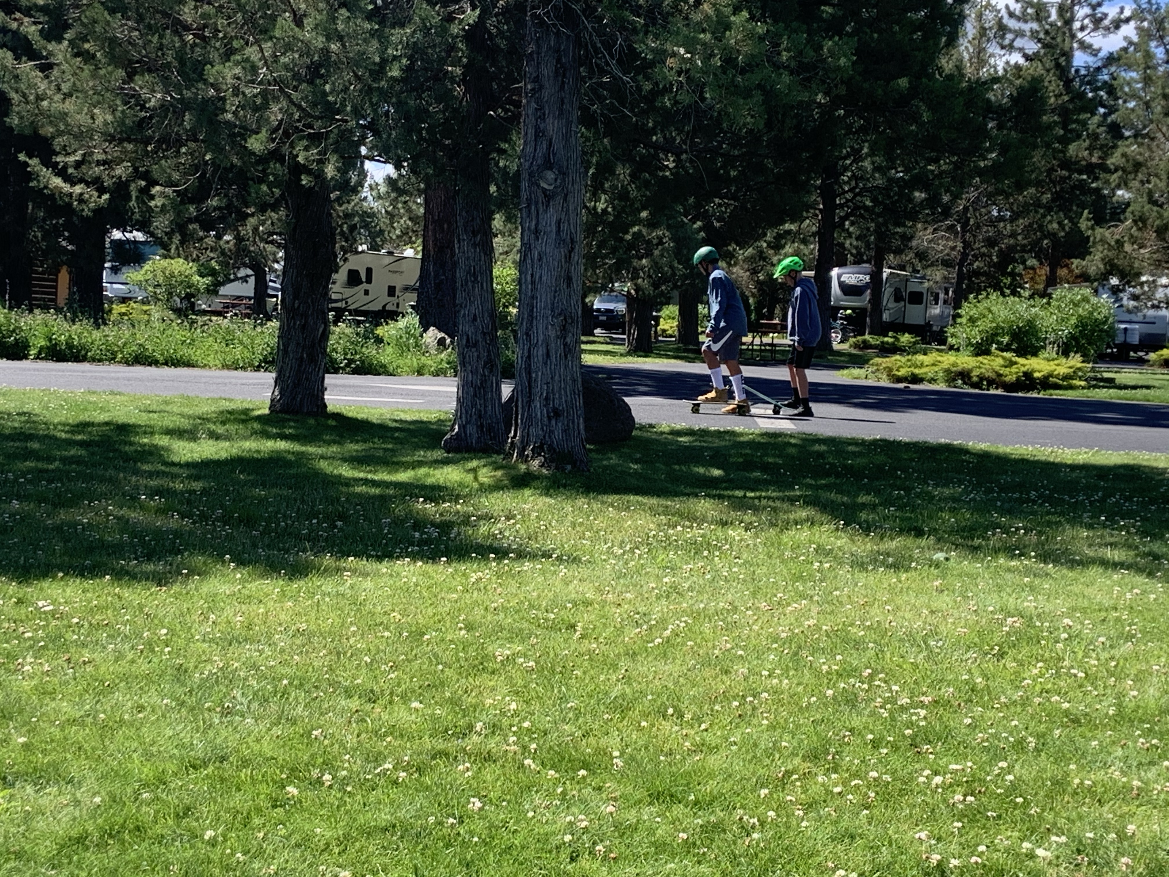 We finally made it to the Bend/Sisters Garden RV Resort. We had a few days to unwind with our great friends, the Reynolds, who joined us for a staycation. The park is right next to the Sister’s Rodeo grounds and some BLM/Forest Service land. We took a few walks and lots of runs along the dirt roads and trails. The kiddos swam, fished and riding through the park on their skateboards. IMHO, this is the park to visit if coming to Central Oregon with an RV.
